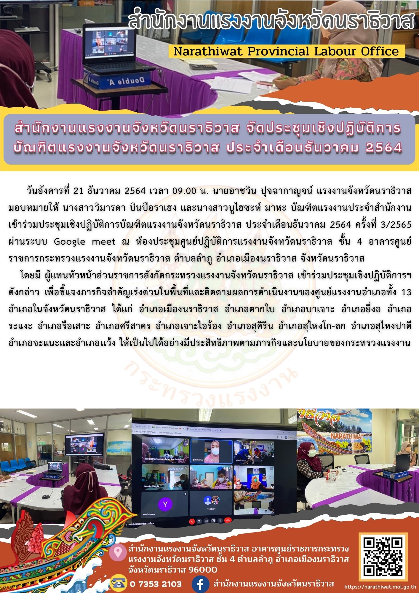 วันอังคารที่ 21 ธันวาคม 2564 เวลา 09.00 น. นายอาชวิน ปุจฉากาญจน์ แรงงานจังหวัดนราธิวาส มอบหมายให้ นางสาววิมารดา บินบือราเฮง และนางสาวบูไฮซะห์ มาหะ บัณฑิตแรงงานประจำสำนักงาน เข้าร่วมประชุมเชิงปฏิบัติการบัณฑิตแรงงานจังหวัดนราธิวาส ประจำเดือนธันวาคม 2564 ครั้งที่ 3/2565 ผ่านระบบ Google meet ณ ห้องประชุมศูนย์ปฏิบัติการแรงงานจังหวัดนราธิวาส ชั้น 4 อาคารศูนย์ราชการกระทรวงแรงงานจังหวัดนราธิวาส ตำบลลำภู อำเภอเมืองนราธิวาส จังหวัดนราธิวาส