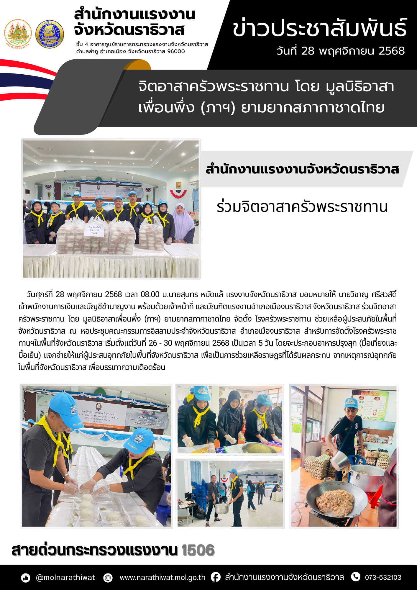 วันศุกร์ที่ 28 พฤศจิกายน 2568 เวลา 08.00 น.นายสุนทร หมัดแล้ แรงงานจังหวัดนราธิวาส มอบหมายให้ นายวิชาญ ศรีสวสัดิ์ เจ้าพนักงานการเงินและบัญชีชำนาญงาน พร้อมด้วยเจ้าหน้าที่ และบัณฑิตแรงงานอำเภอเมืองนราธิวาส จังหวัดนราธิวาส ร่วมจิตอาสาครัวพระราชทาน โดย มูลนิธิอาสาเพื่อนพึ่ง (ภาฯ) ยามยากสภากาชาดไทย จัดตั้ง โรงครัวพระราชทาน ช่วยเหลือผู้ประสบภัยในพื้นที่จังหวัดนราธิวาส ณ หอประชุมคณะกรรมการอิสลามประจำจังหวัดนราธิวาส อำเภอเมืองนราธิวาส สำหรับการจัดตั้งโรงครัวพระราชทานฯในพื้นที่จังหวัดนราธิวาส เริ่มตั้งแต่วันที่ 26 – 30 พฤศจิกายน 2568 เป็นเวลา 5 วัน โดยจะประกอบอาหารปรุงสุก (มื้อเที่ยงและมื้อเย็น) แจกจ่ายให้แก่ผู้ประสบอุทกภัยในพื้นที่จังหวัดนราธิวาส เพื่อเป็นการช่วยเหลือราษฎรที่ได้รับผลกระทบ จากเหตุการณ์อุทกภัยในพื้นที่จังหวัดนราธิวาส เพื่อบรรเทาความเดือดร้อน