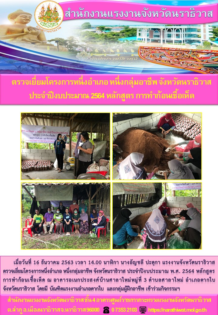 สำนักงานแรงงานจังหวัดนราธิวาส ตรวจเยี่ยมโครงการหนึ่งอำเภอ หนึ่งกลุ่มอาชีพ จังหวัดนราธิวาส ประจำปีงบประมาณ 2564 หลักสูตร การทำก้อนเชื้อเห็ด