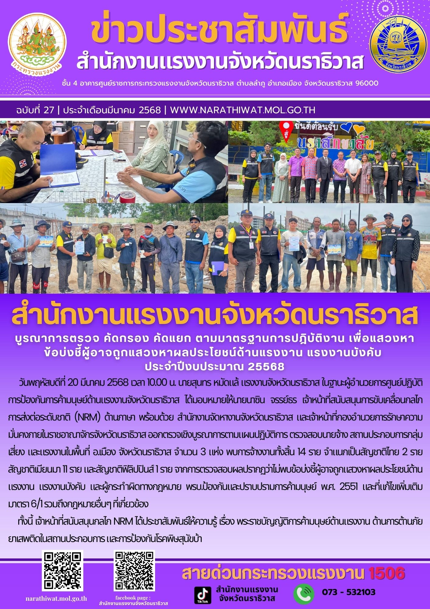 วันพฤหัสบดีที่ 20 มีนาคม 2568 เวลา 10.00 น. นายสุนทร หมัดแล้ แรงงานจังหวัดนราธิวาส ในฐานะผู้อำนวยการศูนย์ปฏิบัติการป้องกันการค้ามนุษย์ด้านแรงงานจังหวัดนราธิวาส ได้มอบหมายให้นายนาซิน จรรย์ธร เจ้าหน้าที่สนับสนุนการขับเคลื่อนกลไกการส่งต่อระดับชาติ (NRM) ด้านภาษา พร้อมด้วย สำนักงานจัดหางานจังหวัดนราธิวาส และเจ้าหน้าที่กองอำนวยการรักษาความมั่นคงภายในราชอาณาจักรจังหวัดนราธิวาส ออกตรวจเชิงบูรณาการตามแผนปฏิบัติการ ตรวจสอบนายจ้าง สถานประกอบการกลุ่มเสี่ยง และแรงงานในพื้นที่ อ.เมือง จังหวัดนราธิวาส จำนวน 3 แห่ง พบการจ้างงานทั้งสิ้น 14 ราย จำแนกเป็นสัญชาติไทย 2 ราย สัญชาติเมียนมา 11 ราย และสัญชาติฟิลิปปินส์ 1 ราย จากการตรวจสอบผลปรากฏว่าไม่พบข้อบ่งชี้ผู้อาจถูกแสวงหาผลประโยชน์ด้านแรงงาน แรงงานบังคับ และผู้กระทำผิดทางกฎหมาย พรบ.ป้องกันและปราบปรามการค้ามนุษย์ พ.ศ. 2551 และที่แก้ไขเพิ่มเติม มาตรา 6/1 รวมถึงกฎหมายอื่นๆ ที่เกี่ยวข้อง