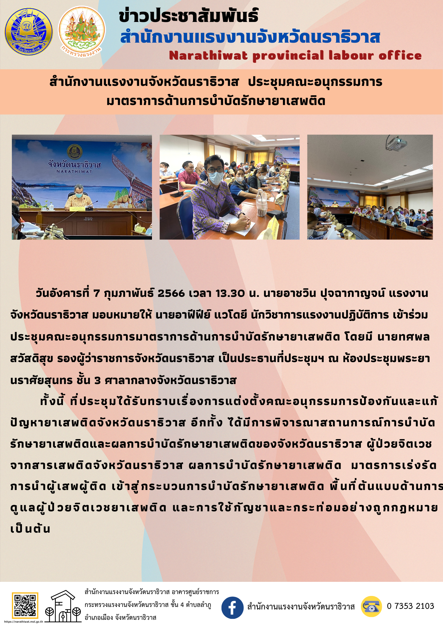 วันอังคารที่ 7 กุมภาพันธ์ 2566 เวลา 13.30 น. นายอาชวิน ปุจฉากาญจน์ แรงงานจังหวัดนราธิวาส มอบหมายให้ นายอาฟีฟีย์ แวโดยี นักวิชาการแรงงานปฏิบัติการ เข้าร่วมประชุมคณะอนุกรรมการมาตราการด้านการบำบัดรักษายาเสพติด โดยมี นายทศพล สวัสดิสุข รองผู้ว่าราชการจังหวัดนราธิวาส เป็นประธานที่ประชุมฯ ณ ห้องประชุมพระยานราศัยสุนทร ชั้น 3 ศาลากลางจังหวัดนราธิวาส ทั้งนี้ ที่ประชุมได้รับทราบเรื่องการแต่งตั้งคณะอนุกรรมการป้องกันและแก้ปัญหายาเสพติดจังหวัดนราธิวาส อีกทั้ง ได้มีการพิจารณาสถานการณ์การบำบัดรักษายาเสพติดและผลการบำบัดรักษายาเสพติดของจังหวัดนราธิวาส ผู้ป่วยจิตเวชจากสารเสพติดจังหวัดนราธิวาส ผลการบำบัดรักษายาเสพติด มาตรการเร่งรัดการนำผู้เสพผู้ติด เข้าสู่กระบวนการบำบัดรักษายาเสพติด พื้นที่ต้นแบบด้านการดูแลผู้ป่วยจิตเวชยาเสพติด และการใช้กัญชาและกระท่อมอย่างถูกกฎหมาย เป็นต้น