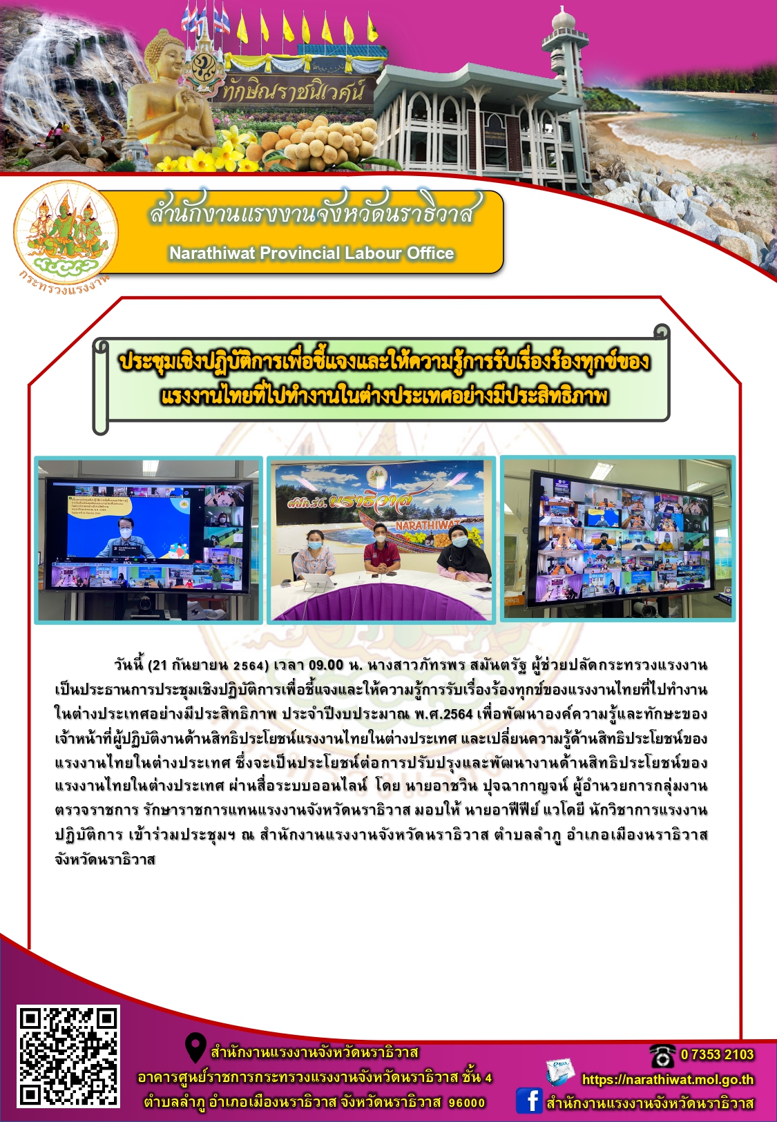 วันนี้ (21 กันยายน 2564) เวลา 09.00 น. นางสาวภัทรพร สมันตรัฐ ผู้ช่วยปลัดกระทรวงแรงงาน เป็นประธานการประชุมเชิงปฏิบัติการเพื่อชี้แจงและให้ความรู้การรับเรื่องร้องทุกข์ของแรงงานไทยที่ไปทำงานในต่างประเทศอย่างมีประสิทธิภาพ ประจำปีงบประมาณ พ.ศ.2564 เพื่อพัฒนาองค์ความรู้และทักษะของเจ้าหน้าที่ผู้ปฏิบัติงานด้านสิทธิประโยชน์แรงงานไทยในต่างประเทศ และเปลี่ยนความรู้ด้านสิทธิประโยชน์ของแรงงานไทยในต่างประเทศ ซึ่งจะเป็นประโยชน์ต่อการปรับปรุงและพัฒนางานด้านสิทธิประโยชน์ของแรงงานไทยในต่างประเทศ ผ่านสื่อระบบออนไลน์ โดย นายอาชวิน ปุจฉากาญจน์ ผู้อำนวยการกลุ่มงานตรวจราชการ รักษาราชการแทนแรงงานจังหวัดนราธิวาส มอบให้ นายอาฟีฟีย์ แวโดยี นักวิชาการแรงงานปฏิบัติการ เข้าร่วมประชุมฯ ณ สำนักงานแรงงานจังหวัดนราธิวาส ตำบลลำภู อำเภอเมืองนราธิวาส จังหวัดนราธิวาส