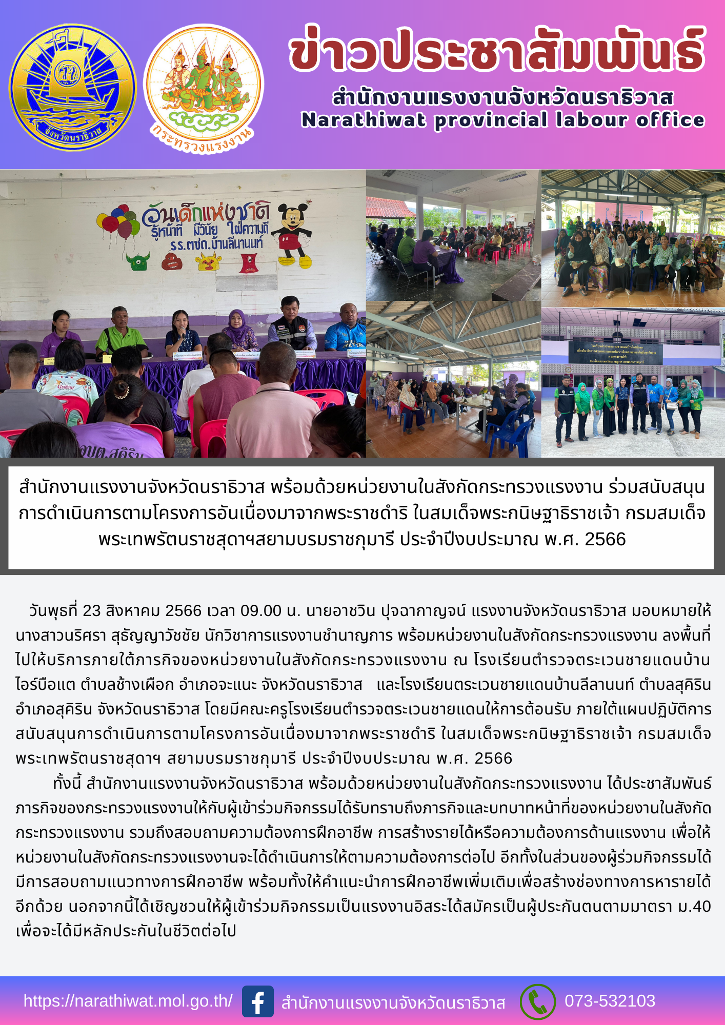 วันพุธที่ 23 สิงหาคม 2566 เวลา 09.30 น. นายอาชวิน ปุจฉากาญจน์ แรงงานจังหวัดนราธิวาส มอบหมายให้ นางสาวนริศรา สุธัญญาวัชชัย นักวิชาการแรงงานชำนาญการ พร้อมหน่วยงานในสังกัดกระทรวงแรงงาน ลงพื้นที่นำบริการด้านแรงงานตามภารกิจของหน่วยงาน ณ โรงเรียนตำรวจตระเวนชายแดนบ้านไอร์บือแต ตำบลช้างเผือก อำเภอจะแนะ จังหวัดนราธิวาส และโรงเรียนตระเวนชายแดนบ้านลีลานนท์ ตำบลสุคิริน อำเภอสุคิริน จังหวัดนราธิวาส โดยมีคณะครูโรงเรียนตำรวจตระเวนชายแดน และผู้นำชุมชนให้การต้อนรับ ภายใต้แผนปฏิบัติการสนับสนุนการดำเนินการตามโครงการอันเนื่องมาจากพระราชดำริ ในสมเด็จพระกนิษฐาธิราชเจ้า กรมสมเด็จพระเทพรัตนราชสุดาฯ สยามบรมราชกุมารี ประจำปีงบประมาณ พ.ศ. 2566