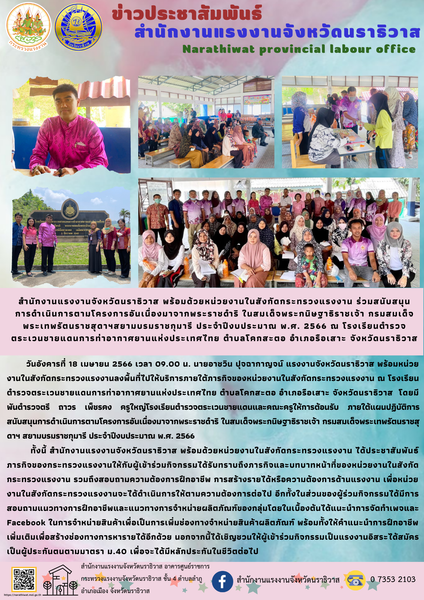วันอังคารที่ 18 เมษายน 2566 เวลา 09.00 น. นายอาชวิน ปุจฉากาญจน์ แรงงานจังหวัดนราธิวาส พร้อมหน่วยงานในสังกัดกระทรวงแรงงานลงพื้นที่ไปให้บริการภายใต้ภารกิจของหน่วยงานในสังกัดกระทรวงแรงงาน ณ โรงเรียนตำรวจตระเวนชายแดนการท่าอากาศยานแห่งประเทศไทย ตำบลโคกสะตอ อำเภอรือเสาะ จังหวัดนราธิวาส โดยมี พันตำรวจตรี ถาวร เพ็ชรคง ครูใหญ่โรงเรียนตำรวจตระเวนชายแดนและคณะครูให้การต้อนรับ ภายใต้แผนปฏิบัติการสนับสนุนการดำเนินการตามโครงการอันเนื่องมาจากพระราชดำริ ในสมเด็จพระกนิษฐาธิราชเจ้า กรมสมเด็จพระเทพรัตนราชสุดาฯ สยามบรมราชกุมารี ประจำปีงบประมาณ พ.ศ. 2566 ทั้งนี้ สำนักงานแรงงานจังหวัดนราธิวาส พร้อมด้วยหน่วยงานในสังกัดกระทรวงแรงงาน ได้ประชาสัมพันธ์ภารกิจของกระทรวงแรงงานให้กับผู้เข้าร่วมกิจกรรมได้รับทราบถึงภารกิจและบทบาทหน้าที่ของหน่วยงานในสังกัดกระทรวงแรงงาน รวมถึงสอบถามความต้องการฝึกอาชีพ การสร้างรายได้หรือความต้องการด้านแรงงาน เพื่อหน่วยงานในสังกัดกระทรวงแรงงานจะได้ดำเนินการให้ตามความต้องการต่อไป อีกทั้งในส่วนของผู้ร่วมกิจกรรมได้มีการสอบถามแนวทางการฝึกอาชีพและแนวทางการจำหน่ายผลิตภัณฑ์ของกลุ่มโดยในเบื้องต้นได้แนะนำการจัดทำเพจและ Facebook ในการจำหน่ายสินค้าเพื่อเป็นการเพิ่มช่องทางจำหน่ายสินค้าผลิตภัณฑ์ พร้อมทั้งให้คำแนะนำการฝึกอาชีพเพิ่มเติมเพื่อสร้างช่องทางการหารายได้อีกด้วย นอกจากนี้ได้เชิญชวนให้ผู้เข้าร่วมกิจกรรมเป็นแรงงานอิสระได้สมัครเป็นผู้ประกันตนตามมาตรา ม.40 เพื่อจะได้มีหลักประกันในชีวิตต่อไป