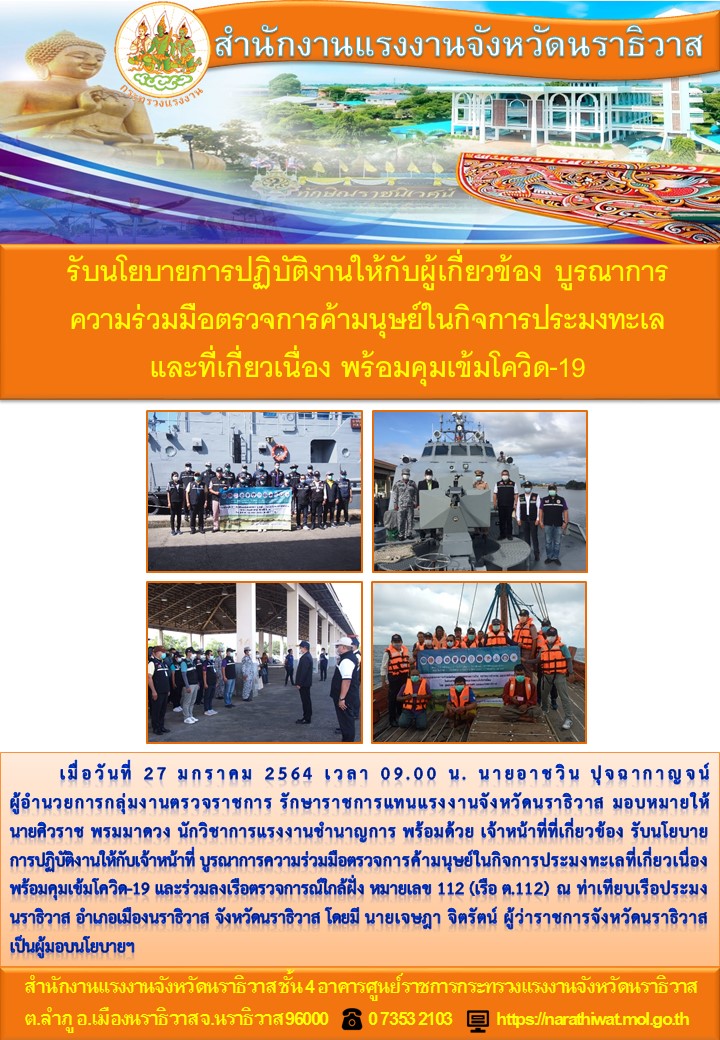 สำนักงานแรงงานจังหวัดนราธิวาส รับนโยบายการปฏิบัติงานให้กับผู้เกี่ยวข้อง บูรณาการความร่วมมือตรวจการค้ามนุษย์ในกิจการประมงทะเลและที่เกี่ยวเนื่อง พร้อมคุมเข้มโควิด-19
