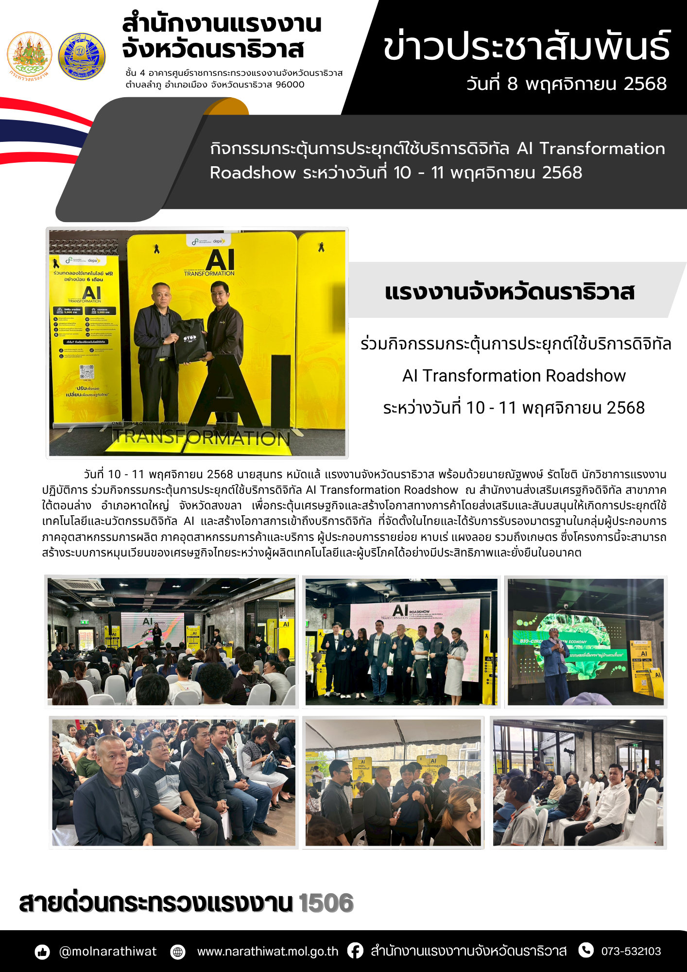 วันที่ 10 – 11 พฤศจิกายน 2568 นายสุนทร หมัดแล้ แรงงานจังหวัดนราธิวาส พร้อมด้วยนายณัฐพงษ์ รัตโชติ นักวิชาการแรงงานปฏิบัติการ ร่วมกิจกรรมกระตุ้นการประยุกต์ใช้บริการดิจิทัล AI Transformation Roadshow ณ สำนักงานส่งเสริมเศรฐกิจดิจิทัล สาขาภาคใต้ตอนล่าง อำเภอหาดใหญ่ จังหวัดสงขลา เพื่อกระตุ้นเศรษฐกิจและสร้างโอกาสทางการค้าโดยส่งเสริมและสันบสนุนให้เกิดการประยุกต์ใช้เทคโนโลยีและนวัตกรรมดิจิทัล AI และสร้างโอกาสการเข้าถึงบริการดิจิทัล ที่จัดตั้งในไทยและได้รับการรับรองมาตรฐานในกลุ่มผู้ประกอบการภาคอุตสาหกรรมการผลิต ภาคอุตสาหกรรมการค้าและบริการ ผู้ประกอบการรายย่อย หาบเร่ แผงลอย รวมถึงเกษตร ซึ่งโครงการนี้จะสามารถสร้างระบบการหมุนเวียนของเศรษฐกิจไทยระหว่างผู้ผลิตเทคโนโลยีและผู้บริโภคได้อย่างมีประสิทธิภาพและยั่งยืนในอนาคต