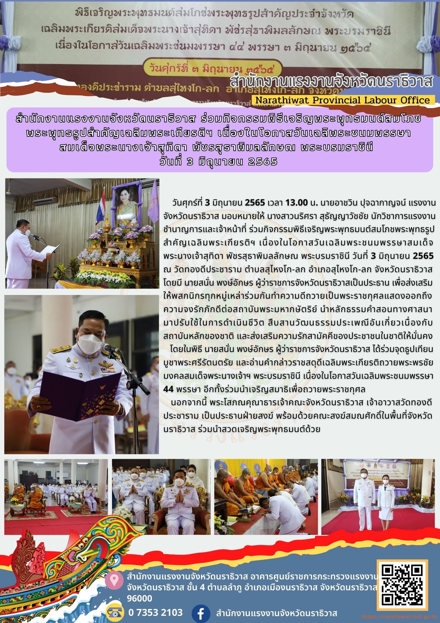 วันศุกร์ที่ 3 มิถุนายน 2565 เวลา 13.00 น. นายอาชวิน ปุจฉากาญจน์ แรงงานจังหวัดนราธิวาส มอบหมายให้ นางสาวนริศรา สุธัญญาวัชชัย นักวิชาการแรงงานชำนาญการและเจ้าหน้าที่ ร่วมกิจกรรมพิธีเจริญพระพุทธมนต์สมโภชพระพุทธรูปสำคัญเฉลิมพระเกียรติฯ เนื่องในโอกาสวันเฉลิมพระชนมพรรษาสมเด็จพระนางเจ้าสุทิดา พัชรสุธาพิมลลักษณ พระบรมราชินี วันที่ 3 มิถุนายน 2565 ณ วัดทองดีประชาราม ตำบลสุไหงโก-ลก อำเภอสุไหงโก-ลก จังหวัดนราธิวาส โดยมี นายสนั่น พงษ์อักษร ผู้ว่าราชการจังหวัดนราธิวาสเป็นประธาน เพื่อส่งเสริมให้พสกนิกรทุกหมู่เหล่าร่วมกันทำความดีถวายเป็นพระราชกุศลแสดงออกถึงความจงรักภักดีต่อสถาบันพระมหากษัตริย์ นำหลักธรรมคำสอนทางศาสนามาปรับใช้ในการดำเนินชีวิต สืบสานวัฒนธรรมประเพณีอันเกี่ยวเนื่องกับสถาบันหลักของชาติ และส่งเสริมความรักสามัคคีของประชาชนในชาติให้มั่นคง