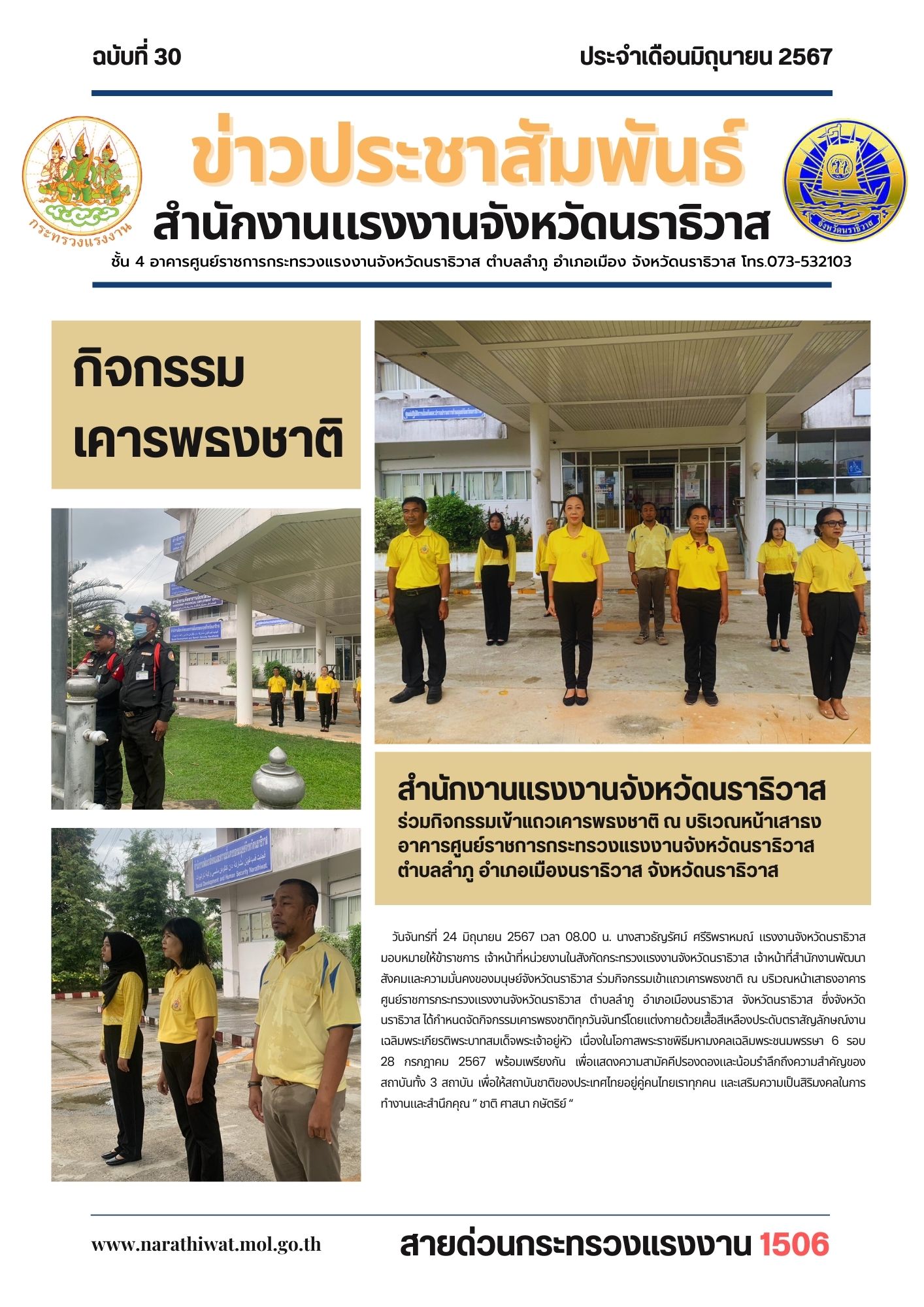 เจ้าหน้าที่หน่วยงานในสังกัดกระทรวงแรงงานจังหวัดนราธิวาส เจ้าหน้าที่สำนักงานพัฒนาสังคมและความมั่นคงของมนุษย์จังหวัดนราธิวาส ร่วมกิจกรรมเข้าแถวเคารพธงชาติ ณ บริเวณหน้าเสาธงอาคารศูนย์ราชการกระทรวงแรงงานจังหวัดนราธิวาส ตำบลลำภู อำเภอเมืองนราธิวาส จังหวัดนราธิวาส ซึ่งจังหวัดนราธิวาส ได้กำหนดจัดกิจกรรมเคารพธงชาติทุกวันจันทร์โดยแต่งกายด้วยเสื้อสีเหลืองประดับตราสัญลักษณ์งานเฉลิมพระเกียรติพระบาทสมเด็จพระเจ้าอยู่หัว เนื่องในโอกาสพระราชพิธีมหามงคลเฉลิมพระชนมพรรษา 6 รอบ 28 กรกฎาคม 2567 พร้อมเพรียงกัน เพื่อแสดงความสามัคคีปรองดองและน้อมรำลึกถึงความสำคัญของสถาบันทั้ง 3 สถาบัน เพื่อให้สถาบันชาติของประเทศไทยอยู่คู่คนไทยเราทุกคน และเสริมความเป็นสิริมงคลในการทำงานและสำนึกคุณ ” ชาติ ศาสนา กษัตริย์ “