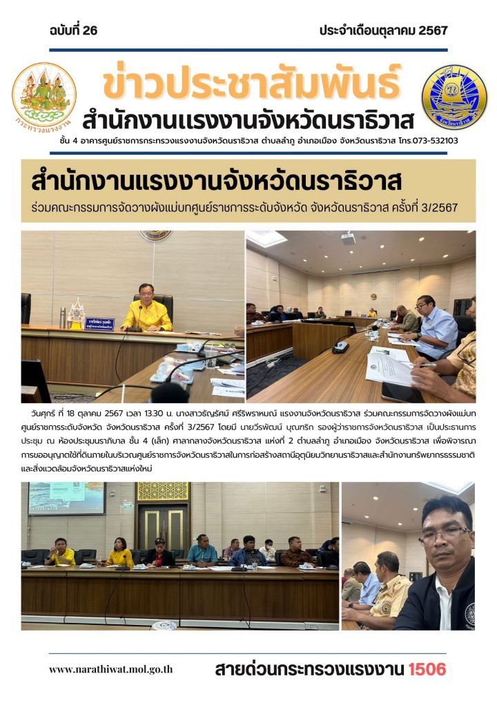 วันศุกร์ ที่ 18 ตุลาคม 2567 เวลา 13.30 น. นางสาวธัญรัศม์ ศรีริพราหมณ์ แรงงานจังหวัดนราธิวาส ร่วมคณะกรรมการจัดวางผังแม่บทศูนย์ราชการระดับจังหวัด จังหวัดนราธิวาส ครั้งที่ 3/2567 โดยมี นายวีรพัฒน์ บุณฑริก รองผู้ว่าราชการจังหวัดนราธิวาส เป็นประธานการประชุม ณ ห้องประชุมนราภิบาล ชั้น 4 (เล็ก) ศาลากลางจังหวัดนราธิวาส แห่งที่ 2 ตำบลลำภู อำเภอเมือง จังหวัดนราธิวาส เพื่อพิจารณา การขออนุญาตใช้ที่ดินภายในบริเวณศูนย์ราชการจังหวัดนราธิวาสในการก่อสร้างสถานีอุตุนิยมวิทยานราธิวาสและสำนักงานทรัพยากรธรรมชาติและสิ่งแวดล้อมจังหวัดนราธิวาสแห่งใหม่