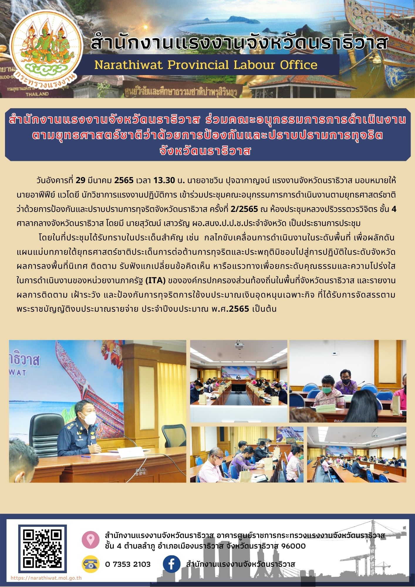 วันอังคารที่ 29 มีนาคม 2565 เวลา 13.30 น. นายอาชวิน ปุจฉากาญจน์ แรงงานจังหวัดนราธิวาส มอบหมายให้ นายอาฟีฟีย์ แวโดยี นักวิชาการแรงงานปฏิบัติการ เข้าร่วมประชุมคณะอนุกรรมการการดำเนินงานตามยุทธศาสตร์ชาติว่าด้วยการป้องกันและปราบปรามการทุจริตจังหวัดนราธิวาส ครั้งที่ 2/2565 ณ ห้องประชุมหลวงปริวรรตวรวิจิตร ชั้น 4 ศาลากลางจังหวัดนราธิวาส โดยมี นายสุวัฒน์ เสาวรัญ ผอ.สนง.ป.ป.ช.ประจำจังหวัด เป็นประธานการประชุม