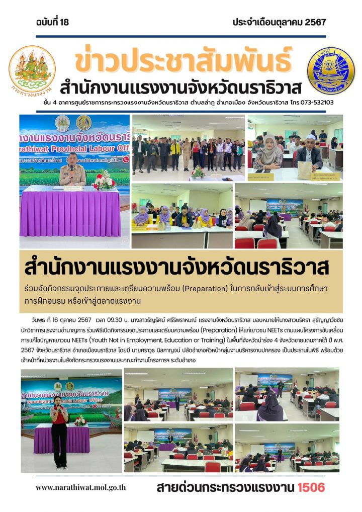วันพุธ ที่ 16 ตุลาคม 2567 เวลา 09.30 น. นางสาวธัญรัศม์ ศรีริพราหมณ์ แรงงานจังหวัดนราธิวาส มอบหมายให้นางสาวนริศรา สุธัญญาวัชชัย นักวิชาการแรงงานชำนาญการ ร่วมพิธีเปิดกิจกรรมจุดประกายและเตรียมความพร้อม (Preparation) ให้แก่เยาวชน NEETs ตามแผนโครงการขับเคลื่อนการแก้ไขปัญหาเยาวชน NEETs (Youth Not in Employment, Education or Training) ในพื้นที่จังหวัดนำร่อง 4 จังหวัดชายแดนภาคใต้ ปี พ.ศ. 2567 จังหวัดนราธิวาส อำเภอเมืองนราธิวาส โดยมี นายศราวุธ นิลกาญจน์ ปลัดอำเภอหัวหน้ากลุ่มงานบริหารงานปกครอง เป็นประธานในพิธี พร้อมด้วย เจ้าหน้าที่หน่วยงานในสังกัดกระทรวงแรงงานและคณะทำงานโครงการฯ ระดับอำเภอ