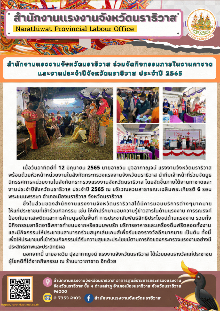 เมื่อวันอาทิตย์ที่ 12 มิถุนายน 2565 นายอาชวิน ปุจฉากาญจน์ แรงงานจังหวัดนราธิวาส พร้อมด้วยหัวหน้าหน่วยงานในสังกัดกระทรวงแรงงานจังหวัดนราธิวาส นำทีมเจ้าหน้าที่ร่วมจัดบูธนิทรรศการหน่วยงานในสังกัดกระทรวงแรงงานจังหวัดนราธิวาส โดยจัดขึ้นภายใต้งานกาชาดและงานประจำปีจังหวัดนราธิวาส ประจำปี 2565 ณ บริเวณสวนสาธารณะเฉลิมพระเกียรติ 6 รอบ พระชนมพรรษา อำเภอเมืองนราธิวาส จังหวัดนราธิวาส
