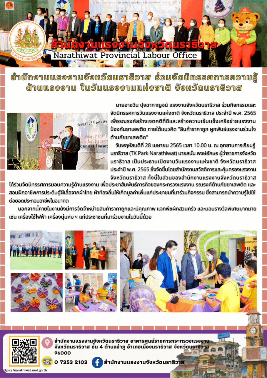 วันพฤหัสบดีที่ 28 เมษายน 2565 เวลา 10.00 น. ณ อุทยานการเรียนรู้นราธิวาส (TK Park Narathiwat) นายสนั่น พงษ์อักษร ผู้ว่าราชการจังหวัดนราธิวาส เป็นประธานเปิดงานวันแรงงานแห่งชาติ จังหวัดนราธิวาส ประจำปี พ.ศ. 2565 ซึ่งจัดขึ้นโดยสำนักงานสวัสดิการและคุ้มครองแรงงานจังหวัดนราธิวาส ทั้งนี้ในส่วนของสำนักงานแรงงานจังหวัดนราธิวาสได้ร่วมจัดนิทรรศการมอบความรู้ด้านแรงงาน เพื่อประชาสัมพันธ์ภารกิจของกระทรวงแรงงาน รณรงค์ต้านภัยยาเสพติด และสอนฝึกอาชีพการประดิษฐ์ผีเสื้อจากผ้าไทย ผ้าท้องถิ่นให้เกิดมูลค่าเพิ่มแก่ประชาชนที่มาร่วมกิจกรรม ซึ่งสามารถนำความรู้ไปใช้ต่อยอดประกอบอาชีพในอนาคต