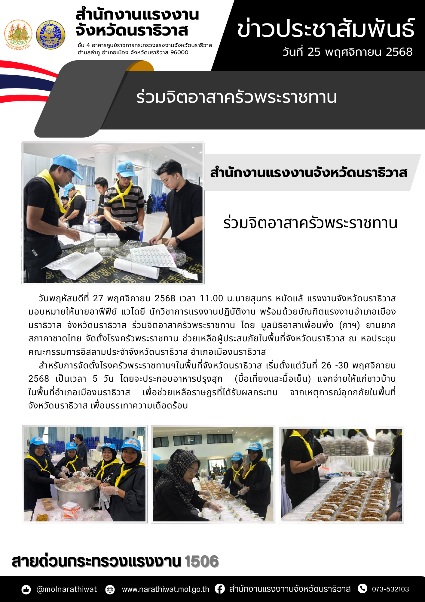 วันพฤหัสบดีที่ 27 พฤศจิกายน 2568 เวลา 11.00 น. นายสุนทร หมัดแล้ แรงงานจังหวัดนราธิวาส มอบหมายให้นายอาฟีฟีย์ แวโดยี นักวิชาการแรงงานปฏิบัติงาน พร้อมด้วยบัณฑิตแรงงานอำเภอเมืองนราธิวาส จังหวัดนราธิวาส ร่วมจิตอาสาครัวพระราชทาน โดย มูลนิธิอาสาเพื่อนพึ่ง (ภาฯ) ยามยากสภากาชาดไทย จัดตั้งโรงครัวพระราชทาน ช่วยเหลือผู้ประสบภัยในพื้นที่จังหวัดนราธิวาส ณ หอประชุมคณะกรรมการอิสลามประจำจังหวัดนราธิวาส อำเภอเมืองนราธิวาส สำหรับการจัดตั้งโรงครัวพระราชทานฯในพื้นที่จังหวัดนราธิวาส เริ่มตั้งแต่วันที่ 26 -30 พฤศจิกายน 2568 เป็นเวลา 5 วัน โดยจะประกอบอาหารปรุงสุก (มื้อเที่ยงและมื้อเย็น) แจกจ่ายให้แก่ชาวบ้าน ในพื้นที่อำเภอเมืองนราธิวาส เพื่อช่วยเหลือราษฎรที่ได้รับผลกระทบ จากเหตุการณ์อุทกภัยในพื้นที่จังหวัดนราธิวาส เพื่อบรรเทาความเดือดร้อน