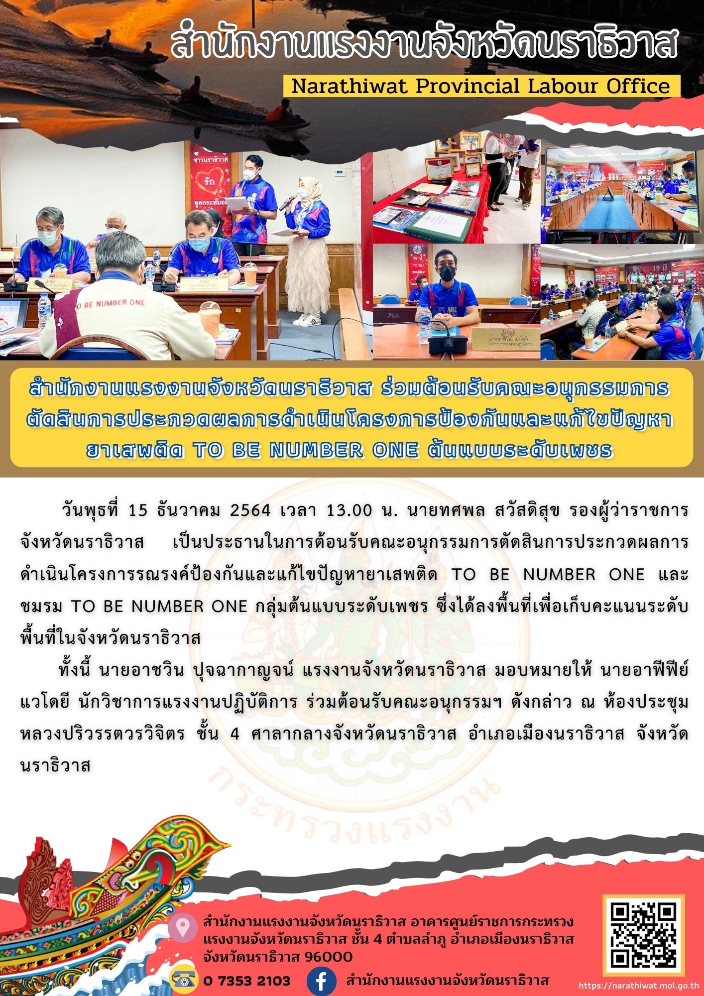 วันพุธที่ 15 ธันวาคม 2564 เวลา 13.00 น. นายทศพล สวัสดิสุข รองผู้ว่าราชการจังหวัดนราธิวาส เป็นประธานในการต้อนรับคณะอนุกรรมการตัดสินการประกวดผลการดำเนินโครงการรณรงค์ป้องกันและแก้ไขปัญหายาเสพติด TO BE NUMBER ONE และชมรม TO BE NUMBER ONE กลุ่มต้นแบบระดับเพชร ซึ่งได้ลงพื้นที่เพื่อเก็บคะแนนระดับพื้นที่ในจังหวัดนราธิวาส