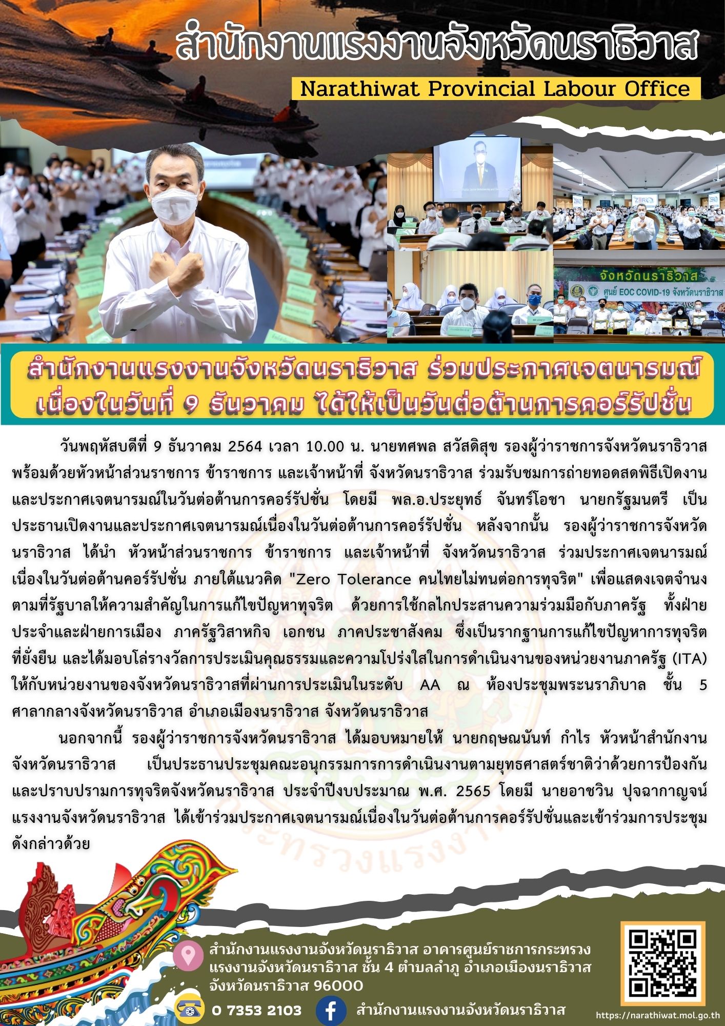 วันพฤหัสบดีที่ 9 ธันวาคม 2564 เวลา 10.00 น. นายทศพล สวัสดิสุข รองผู้ว่าราชการจังหวัดนราธิวาส พร้อมด้วยหัวหน้าส่วนราชการ ข้าราชการ และเจ้าหน้าที่ จังหวัดนราธิวาส ร่วมรับชมการถ่ายทอดสดพิธีเปิดงานและประกาศเจตนารมณ์ในวันต่อต้านการคอร์รัปชั่น โดยมี พล.อ.ประยุทธ์ จันทร์โอชา นายกรัฐมนตรี เป็นประธานเปิดงานและประกาศเจตนารมณ์เนื่องในวันต่อต้านการคอร์รัปชั่น หลังจากนั้น รองผู้ว่าราชการจังหวัดนราธิวาส ได้นำ หัวหน้าส่วนราชการ ข้าราชการ และเจ้าหน้าที่ จังหวัดนราธิวาส ร่วมประกาศเจตนารมณ์ เนื่องในวันต่อต้านคอร์รัปชั่น ภายใต้แนวคิด “Zero Tolerance คนไทยไม่ทนต่อการทุจริต” เพื่อแสดงเจตจำนงตามที่รัฐบาลให้ความสำคัญในการแก้ไขปัญหาทุจริต ด้วยการใช้กลไกประสานความร่วมมือกับภาครัฐ ทั้งฝ่ายประจำและฝ่ายการเมือง ภาครัฐวิสาหกิจ เอกชน ภาคประชาสังคม ซึ่งเป็นรากฐานการแก้ไขปัญหาการทุจริต ที่ยั่งยืน และได้มอบโล่รางวัลการประเมินคุณธรรมและความโปร่งใสในการดำเนินงานของหน่วยงานภาครัฐ (ITA) ให้กับหน่วยงานของจังหวัดนราธิวาสที่ผ่านการประเมินในระดับ AA ณ ห้องประชุมพระนราภิบาล ชั้น 5 ศาลากลางจังหวัดนราธิวาส อำเภอเมืองนราธิวาส จังหวัดนราธิวาส
