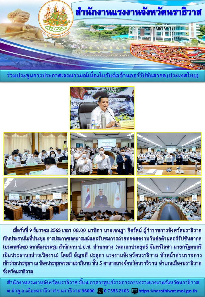 สำนักงานแรงงานจังหวัดนราธิวาส ร่วมประชุมการประกาศเจตนารมณ์และรับชมการถ่ายทอดสดงานวันต่อต้านคอร์รัปชันสากล (ประเทศไทย)