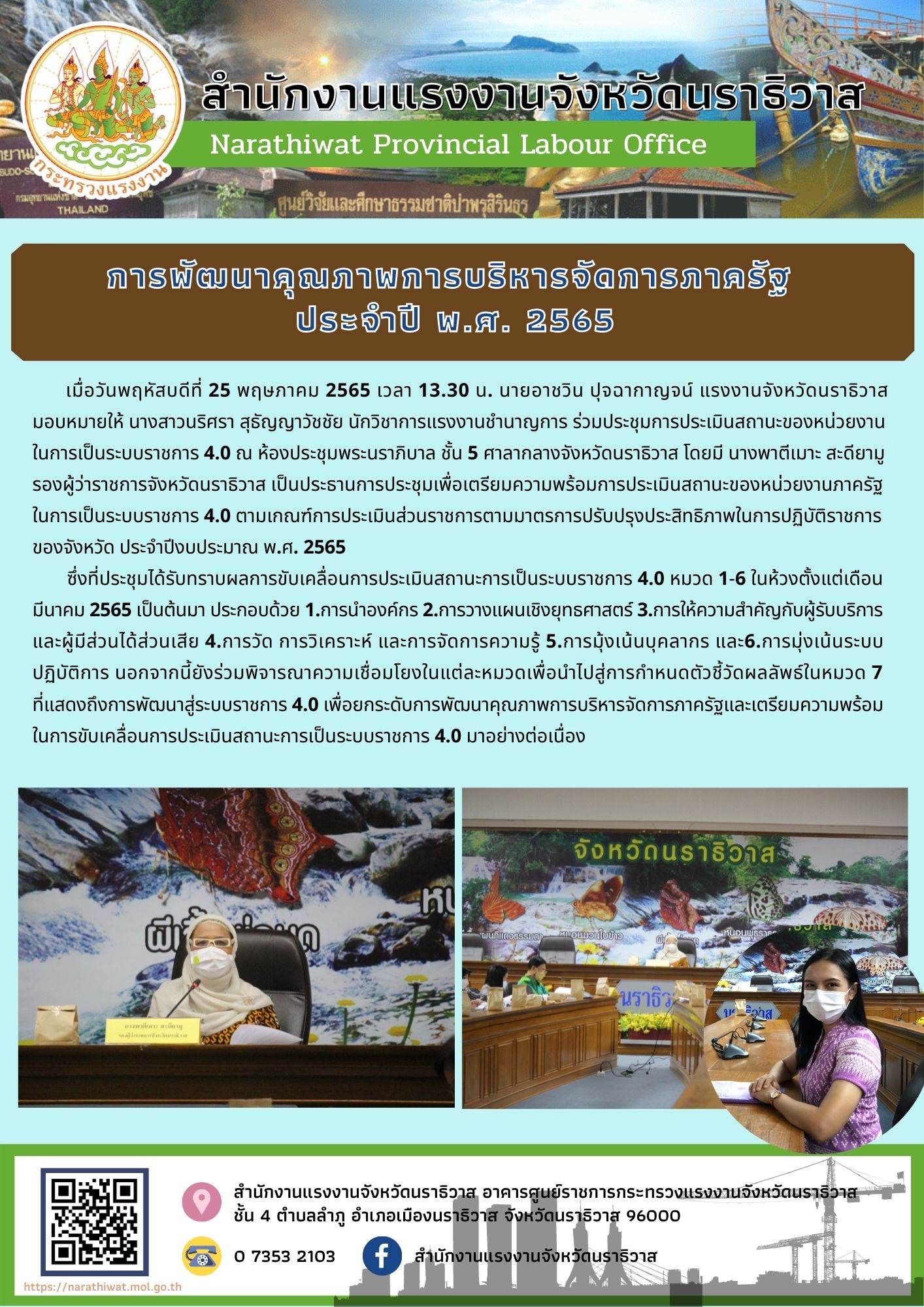 เมื่อวันพฤหัสบดีที่ 25 พฤษภาคม 2565 เวลา 13.30 น. นายอาชวิน ปุจฉากาญจน์ แรงงานจังหวัดนราธิวาส มอบหมายให้ นางสาวนริศรา สุธัญญาวัชชัย นักวิชาการแรงงานชำนาญการ ร่วมประชุมการประเมินสถานะของหน่วยงานในการเป็นระบบราชการ 4.0 ณ ห้องประชุมพระนราภิบาล ชั้น 5 ศาลากลางจังหวัดนราธิวาส โดยมี นางพาตีเมาะ สะดียามู รองผู้ว่าราชการจังหวัดนราธิวาส เป็นประธานการประชุมเพื่อเตรียมความพร้อมการประเมินสถานะของหน่วยงานภาครัฐในการเป็นระบบราชการ 4.0 ตามเกณฑ์การประเมินส่วนราชการตามมาตรการปรับปรุงประสิทธิภาพในการปฏิบัติราชการของจังหวัด ประจำปีงบประมาณ พ.ศ. 2565