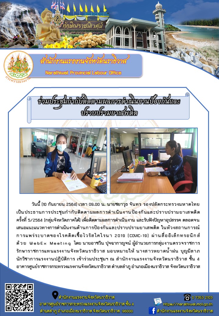 วันนี้ (10 กันยายน 2564) เวลา 09.00 น. นายชยาวุธ จันทร รองปลัดกระทรวงมหาดไทยเป็นประธานการประชุมกำกับติดตามผลการดำเนินงานป้องกันและปราบปรามยาเสพติดครั้งที่ 5/2564 (กลุ่มจังหวัดภาคใต้) เพื่อติดตามผลการดำเนินงาน และรับฟังปัญหาอุปสรรค ตลอดจนเสนอแนะแนวทางการดำเนินงานด้านการป้องกันและปราบปรามยาเสพติด ในห้วงสถานการณ์การแพร่ระบาดของโรคติดเชื้อไวรัสโคโรนา 2019 (COVIC-19) ผ่านสื่ออิเล็กทรอนิกส์ด้วย WebEx Meeting โดย นายอาชวิน ปุจฉากาญจน์ ผู้อำนวยการกลุ่มงานตรวจราชการรักษาราชการแทนแรงงานจังหวัดนราธิวาส มอบหมายให้ นางสาวหยาดน้ำฝน บุญมีลาภนักวิชาการแรงงานปฏิบัติการ เข้าร่วมประชุมฯ ณ สำนักงานแรงงานจังหวัดนราธิวาส ชั้น 4อาคารศูนย์ราชการกระทรวงแรงงานจังหวัดนราธิวาส ตำบลลำภู อำเภอเมืองนราธิวาส จังหวัดนราธิวาส