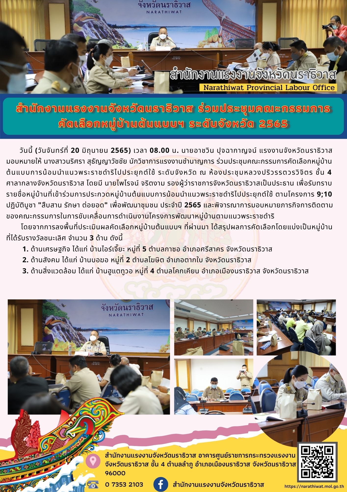 วันนี้ (วันจันทร์ที่ 20 มิถุนายน 2565) เวลา 08.00 น. นายอาชวิน ปุจฉากาญจน์ แรงงานจังหวัดนราธิวาส มอบหมายให้ นางสาวนริศรา สุธัญญาวัชชัย นักวิชาการแรงงานชำนาญการ ร่วมประชุมคณะกรรมการคัดเลือกหมู่บ้านต้นแบบการน้อมนำแนวพระราชดำริไปประยุกต์ใช้ ระดับจังหวัด ณ ห้องประชุมหลวงปริวรรตวรวิจิตร ชั้น 4 ศาลากลางจังหวัดนราธิวาส โดยมี นายไพโรจน์ จริตงาม รองผู้ว่าราชการจังหวัดนราธิวาสเป็นประธาน เพื่อรับทราบรายชื่อหมู่บ้านที่เข้าร่วมการประกวดหมู่บ้านต้นแบบการน้อมนำแนวพระราชดำริไปประยุกต์ใช้ ตามโครงการ 9;10 ปฏิบัติบูชา “สืบสาน รักษา ต่อยอด” เพื่อพัฒนาชุมชน ประจำปี 2565 และพิจารณาการมอบหมายภารกิจการติดตามของคณะกรรมการในการขับเคลื่อนการดำเนินงานโครงการพัฒนาหมู่บ้านตามแนวพระราชดำริ