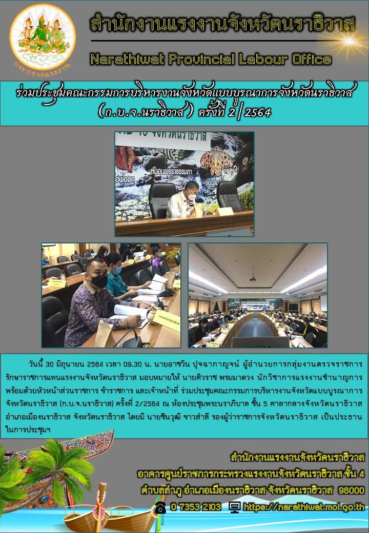 วันนี้ 30 มิถุนายน 2564 เวลา 09.30 น. นายอาชวิน ปุจฉากาญจน์ ผู้อำนวยการกลุ่มงานตรวจราชการ รักษาราชการแทนแรงงานจังหวัดนราธิวาส มอบหมายให้ นายศิวราช พรมมาดวง นักวิชาการแรงงานชำนาญการพร้อมด้วยหัวหน้าส่วนราชการ ข้าราชการ และเจ้าหน้าที่ ร่วมประชุมคณะกรรมการบริหารงานจังหวัดแบบบูรณาการจังหวัดนราธิวาส (ก.บ.จ.นราธิวาส) ครั้งที่ 2/2564 ณ ห้องประชุมพระนราภิบาล ชั้น 5 ศาลากลางจังหวัดนราธิวาส อำเภอเมืองนราธิวาส จังหวัดนราธิวาส โดยมี นายชินวุฒิ ขาวสำลี รองผู้ว่าราชการจังหวัดนราธิวาส เป็นประธานในการประชุมฯ