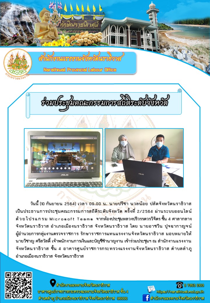 วันนี้ (10 กันยายน 2564) เวลา 09.00 น. นายปรีชา นวลน้อย ปลัดจังหวัดนราธิวาสเป็นประธานการประชุมคณะกรรมการสถิติระดับจังหวัด ครั้งที่ 2/2564 ผ่านระบบออนไลน์ด้วยโปรแกรม Microsoft Teams จากห้องประชุมหลวงปริวรรตวรวิจิตร ชั้น 4 ศาลากลางจังหวัดนราธิวาส อำเภอเมืองนราธิวาส จังหวัดนราธิวาส โดย นายอาชวิน ปุจฉากาญจน์ ผู้อำนวยการกลุ่มงานตรวจราชการ รักษาราชการแทนแรงงานจังหวัดนราธิวาส มอบหมายให้ นายวิชาญ ศรีสวัสดิ์ เจ้าพนักงานการเงินและบัญชีชำนาญงาน เข้าร่วมประชุมฯ ณ สำนักงานแรงงานจังหวัดนราธิวาส ชั้น 4 อาคารศูนย์ราชการกระทรวงแรงงานจังหวัดนราธิวาส ตำบลลำภู อำเภอเมืองนราธิวาส จังหวัดนราธิวาส
