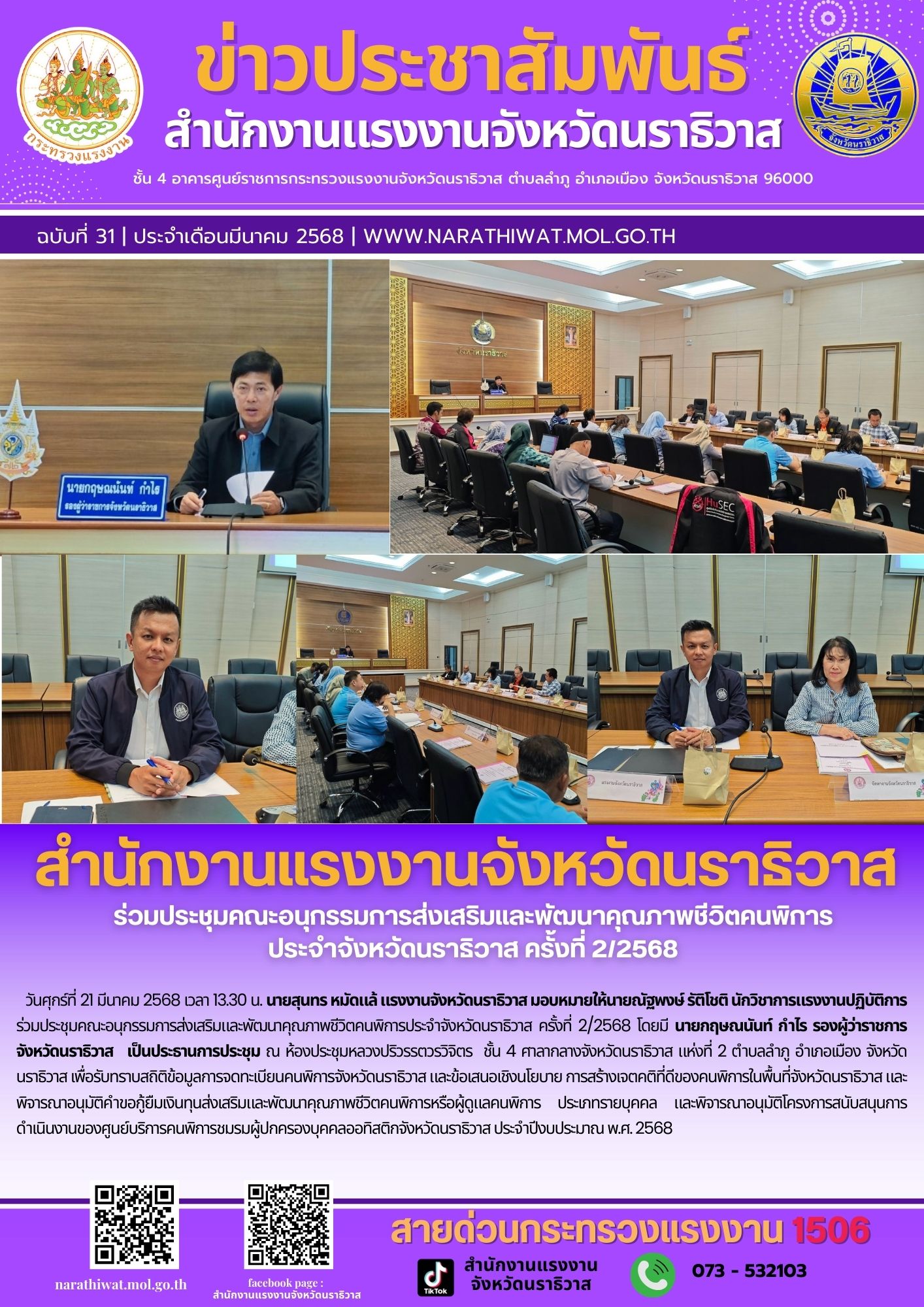 วันศุกร์ที่ 21 มีนาคม 2568 เวลา 13.30 น. นายสุนทร หมัดแล้ แรงงานจังหวัดนราธิวาส มอบหมายให้นายณัฐพงษ์ รัติโชติ นักวิชาการแรงงานปฏิบัติการ ร่วมประชุมคณะอนุกรรมการส่งเสริมและพัฒนาคุณภาพชีวิตคนพิการประจำจังหวัดนราธิวาส ครั้งที่ 2/2568 โดยมี นายกฤษณนันท์ กำไร รองผู้ว่าราชการจังหวัดนราธิวาส เป็นประธานการประชุม ณ ห้องประชุมหลวงปริวรรตวรวิจิตร ชั้น 4 ศาลากลางจังหวัดนราธิวาส แห่งที่ 2 ตำบลลำภู อำเภอเมือง จังหวัดนราธิวาส เพื่อรับทราบสถิติข้อมูลการจดทะเบียนคนพิการจังหวัดนราธิวาส และข้อเสนอเชิงนโยบาย การสร้างเจตคติที่ดีของคนพิการในพื้นที่จังหวัดนราธิวาส และพิจารณาอนุมัติคำขอกู้ยืมเงินทุนส่งเสริมและพัฒนาคุณภาพชีวิตคนพิการหรือผู้ดูแลคนพิการ ประเภทรายบุคคล และพิจารณาอนุมัติโครงการสนับสนุนการดำเนินงานของศูนย์บริการคนพิการชมรมผู้ปกครองบุคคลออทิสติกจังหวัดนราธิวาส ประจำปีงบประมาณ พ.ศ. 2568