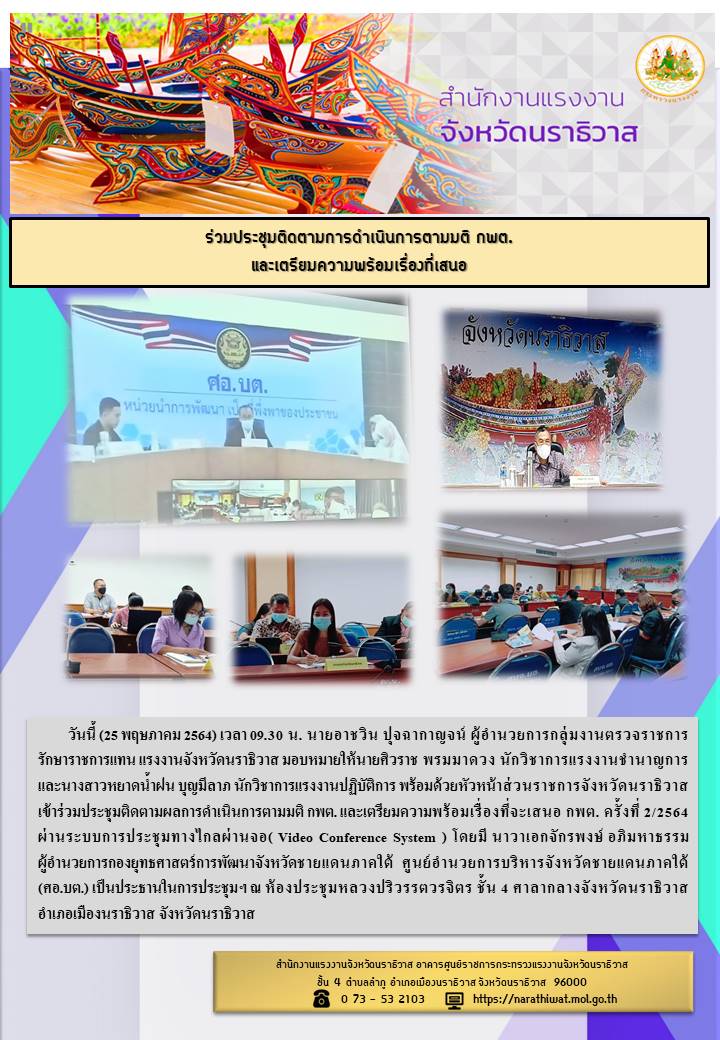 วันนี้ 25 พฤษภาคม 2564 เวลา 09.30 น. นายอาชวิน ปุจฉากาญจน์ ผู้อำนวยการกลุ่มงานตรวจราชการ รักษาราชการแทน แรงงานจังหวัดนราธิวาส มอบหมายให้นายศิวราช พรมมาดวง นักวิชาการแรงงานชำนาญการและนางสาวหยาดน้ำฝน บุญมีลาภ นักวิชาการแรงงานปฏิบัติการ พร้อมด้วยหัวหน้าส่วนราชการจังหวัดนราธิวาสเข้าร่วมประชุมติดตามผลการดำเนินการตามมติ กพต. และเตรียมความพร้อมเรื่องที่จะเสนอ กพต. ครั้งที่ 2/2564 ผ่านระบบการประชุมทางไกลผ่านจอ( Video Conference System ) โดยมี นาวาเอกจักรพงษ์ อภิมหาธรรม ผู้อำนวยการกองยุทธศาสตร์การพัฒนาจังหวัดชายแดนภาคใต้ ศูนย์อำนวยการบริหารจังหวัดชายแดนภาคใต้ (ศอ.บต.) เป็นประธานในการประชุมฯ ณ ห้องประชุมหลวงปริวรรตวรจิตร ชั้น 4 ศาลากลางจังหวัดนราธิวาส อำเภอเมืองนราธิวาส จังหวัดนราธิวาส