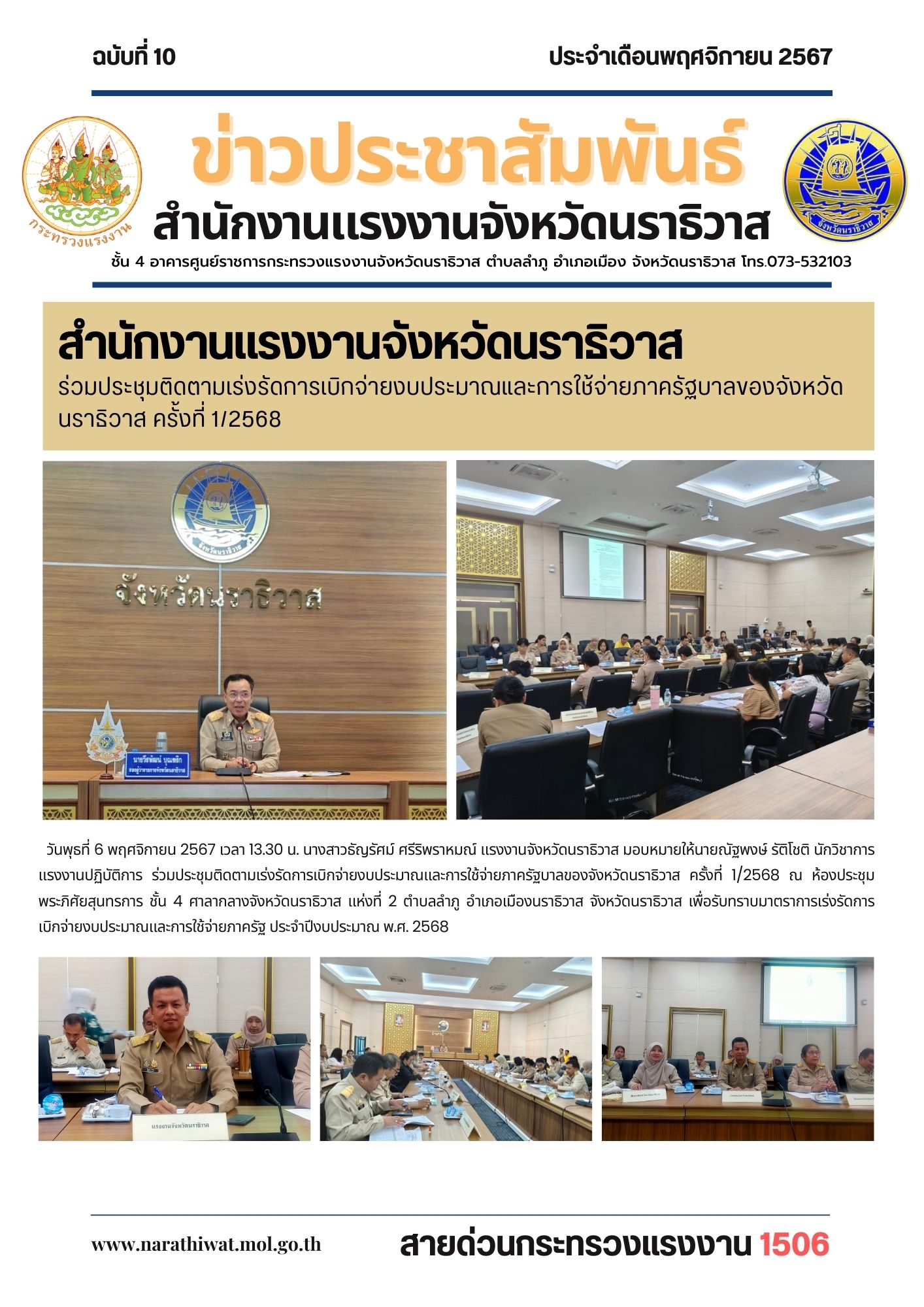 วันพุธที่ 6 พฤศจิกายน 2567 เวลา 13.30 น. นางสาวธัญรัศม์ ศรีริพราหมณ์ แรงงานจังหวัดนราธิวาส มอบหมายให้นายณัฐพงษ์ รัติโชติ นักวิชาการแรงงานปฏิบัติการ ร่วมประชุมติดตามเร่งรัดการเบิกจ่ายงบประมาณและการใช้จ่ายภาครัฐบาลของจังหวัดนราธิวาส ครั้งที่ 1/2568 ณ ห้องประชุม พระภิศัยสุนทรการ ชั้น 4 ศาลากลางจังหวัดนราธิวาส แห่งที่ 2 ตำบลลำภู อำเภอเมืองนราธิวาส จังหวัดนราธิวาส เพื่อรับทราบมาตราการเร่งรัดการ เบิกจ่ายงบประมาณและการใช้จ่ายภาครัฐ ประจำปีงบประมาณ พ.ศ. 2568
