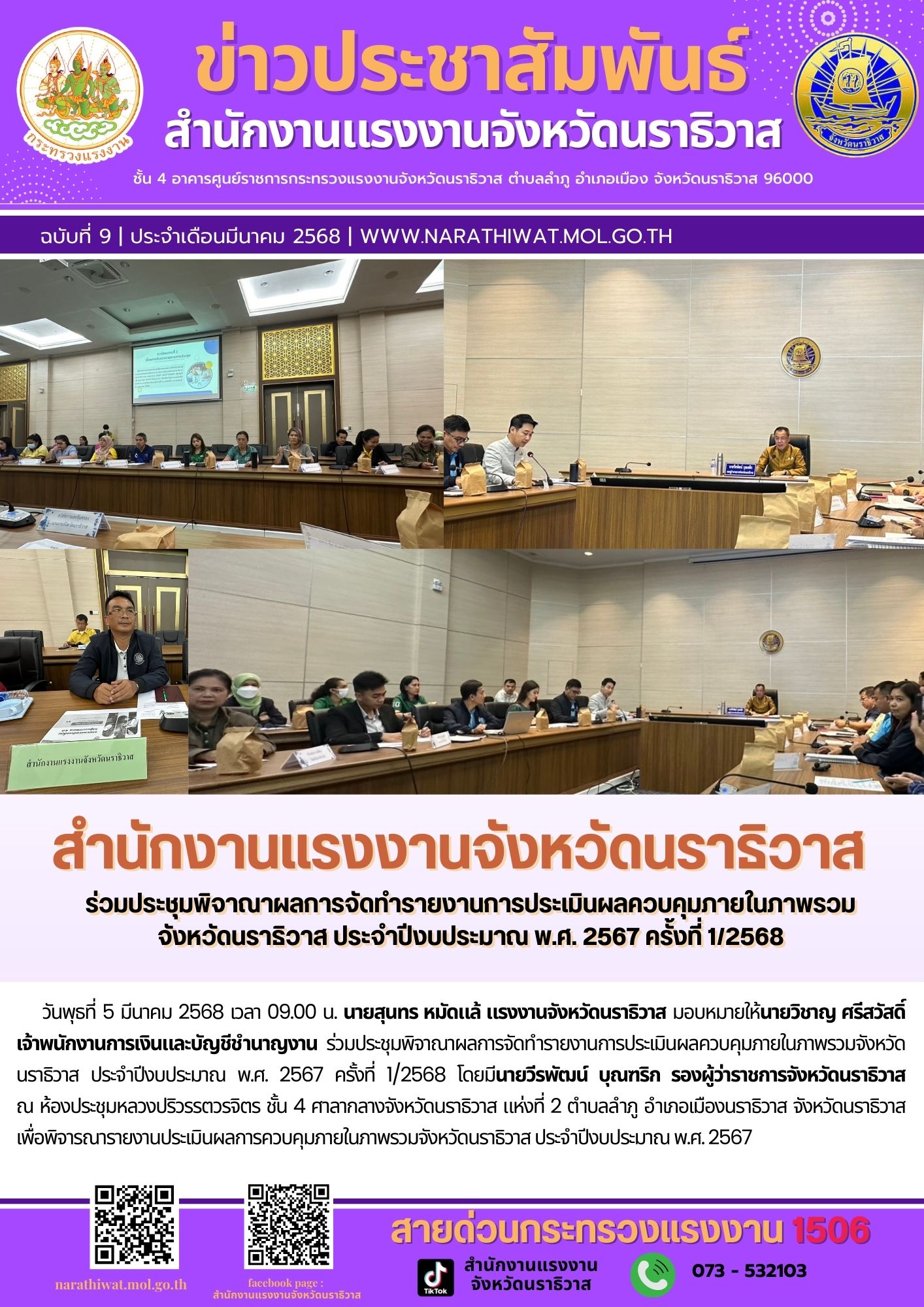 วันพุธที่ 5 มีนาคม 2568 เวลา 09.00 น. นายสุนทร หมัดแล้ แรงงานจังหวัดนราธิวาส มอบหมายให้นายวิชาญ ศรีสวัสดิ์ เจ้าพนักงานการเงินและบัญชีชำนาญงาน ร่วมประชุมพิจาณาผลการจัดทำรายงานการประเมินผลควบคุมภายในภาพรวมจังหวัดนราธิวาส ประจำปีงบประมาณ พ.ศ. 2567 ครั้งที่ 1/2568 โดยมีนายวีรพัฒน์ บุณฑริก รองผู้ว่าราชการจังหวัดนราธิวาส ณ ห้องประชุมหลวงปริวรรตวรจิตร ชั้น 4 ศาลากลางจังหวัดนราธิวาส แห่งที่ 2 ตำบลลำภู อำเภอเมืองนราธิวาส จังหวัดนราธิวาส เพื่อพิจารณารายงานประเมินผลการควบคุมภายในภาพรวมจังหวัดนราธิวาส ประจำปีงบประมาณ พ.ศ. 2567