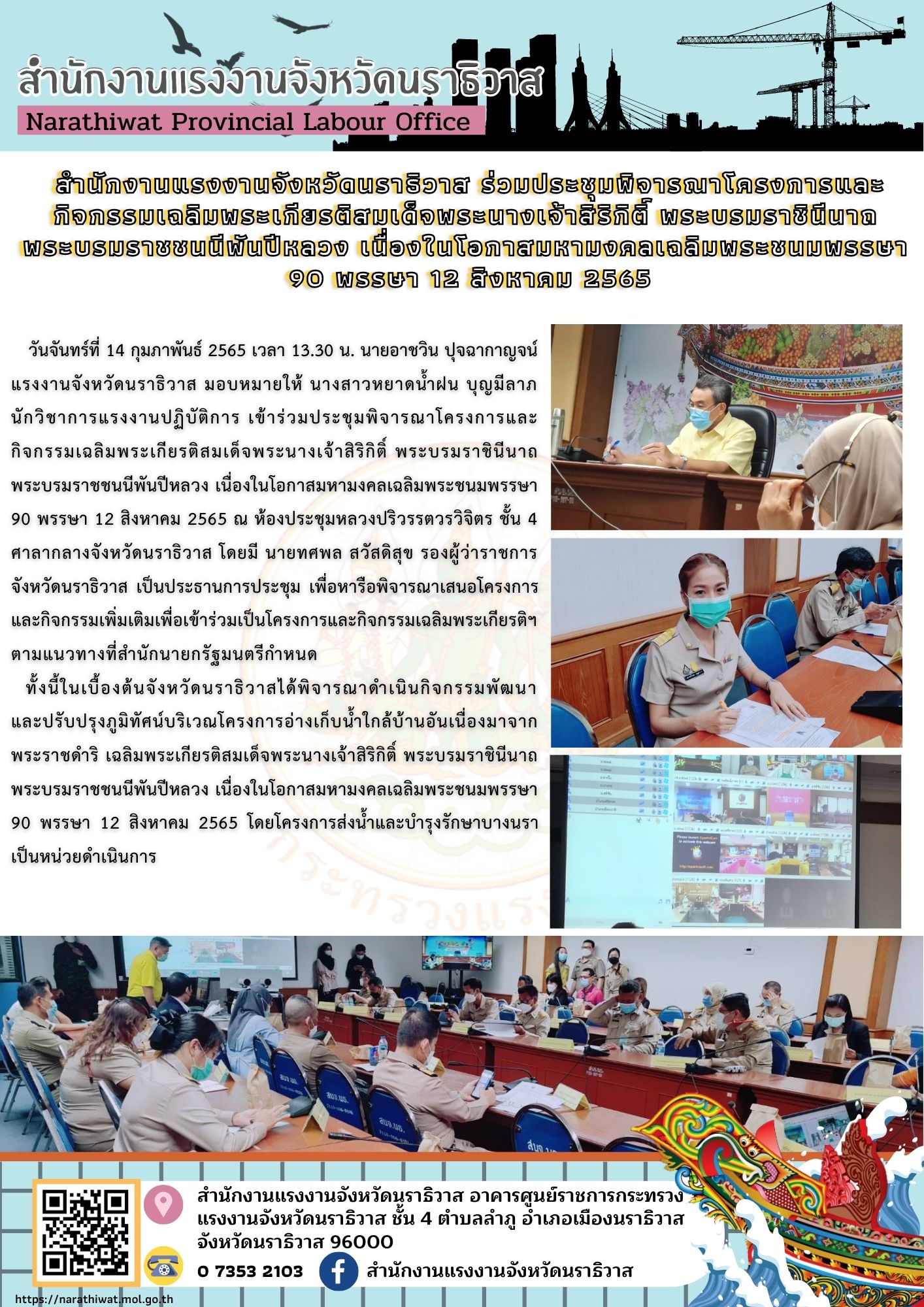 วันจันทร์ที่ 14 กุมภาพันธ์ 2565 เวลา 13.30 น. นายอาชวิน ปุจฉากาญจน์ แรงงานจังหวัดนราธิวาส มอบหมายให้ นางสาวหยาดน้ำฝน บุญมีลาภ นักวิชาการแรงงานปฏิบัติการ เข้าร่วมประชุมพิจารณาโครงการและกิจกรรมเฉลิมพระเกียรติสมเด็จพระนางเจ้าสิริกิติ์ พระบรมราชินีนาถ พระบรมราชชนนีพันปีหลวง เนื่องในโอกาสมหามงคลเฉลิมพระชนมพรรษา 90 พรรษา 12 สิงหาคม 2565 ณ ห้องประชุมหลวงปริวรรตวรวิจิตร ชั้น 4 ศาลากลางจังหวัดนราธิวาส โดยมี นายทศพล สวัสดิสุข รองผู้ว่าราชการจังหวัดนราธิวาส เป็นประธานการประชุม เพื่อหารือพิจารณาเสนอโครงการและกิจกรรมเพิ่มเติมเพื่อเข้าร่วมเป็นโครงการและกิจกรรมเฉลิมพระเกียรติฯ ตามแนวทางที่สำนักนายกรัฐมนตรีกำหนด