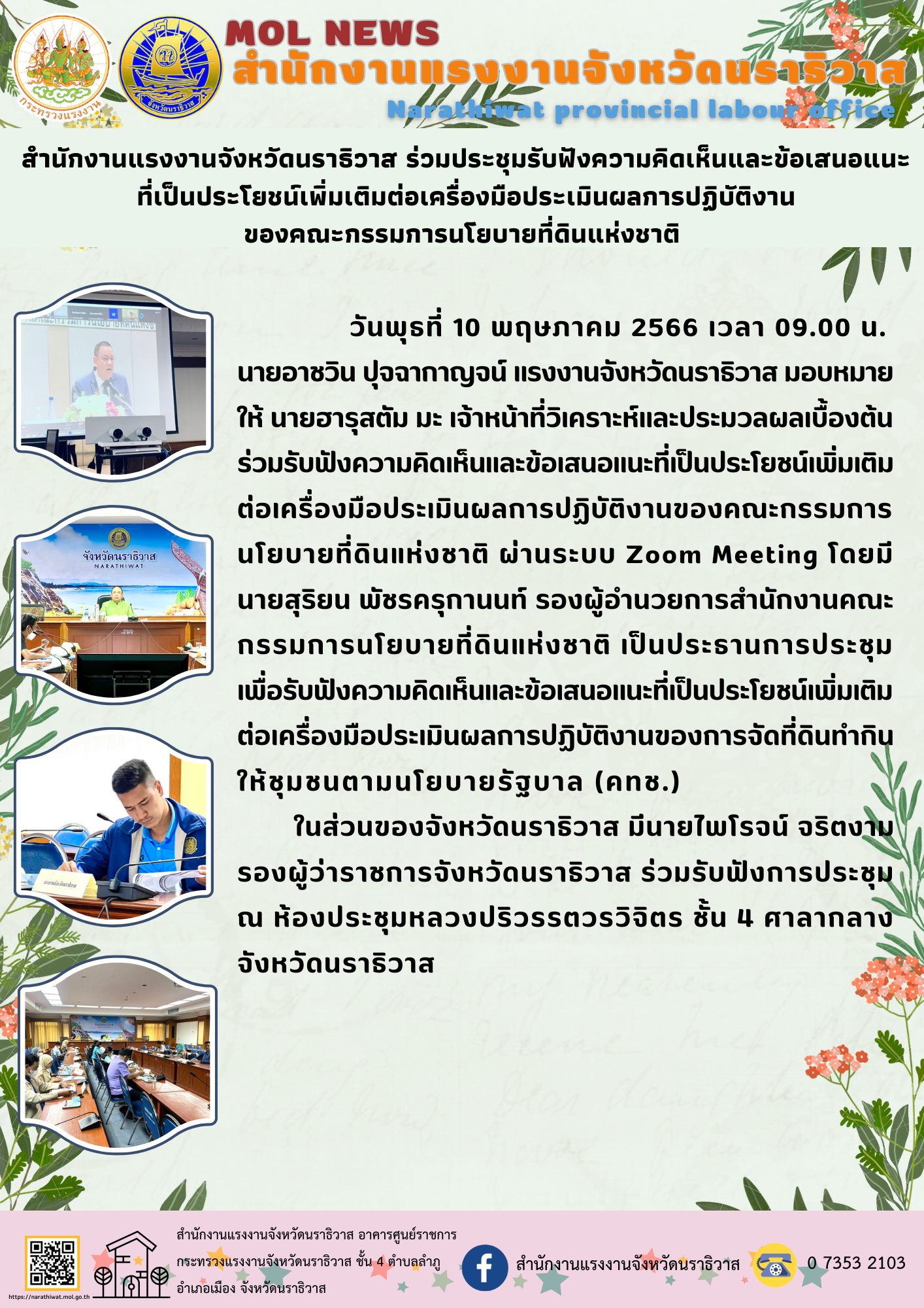 วันพุธที่ 10 พฤษภาคม 2566 เวลา 09.00 น. นายอาชวิน ปุจฉากาญจน์ แรงงานจังหวัดนราธิวาส มอบหมายให้ นายฮารุสตัม มะ เจ้าหน้าที่วิเคราะห์และประมวลผลเบื้องต้น ร่วมรับฟังความคิดเห็นและข้อเสนอแนะที่เป็นประโยชน์เพิ่มเติมต่อเครื่องมือประเมินผลการปฏิบัติงานของคณะกรรมการนโยบายที่ดินแห่งชาติ ผ่านระบบ Zoom Meeting โดยมี นายสุริยน พัชรครุกานนท์ รองผู้อำนวยการสำนักงานคณะกรรมการนโยบายที่ดินแห่งชาติ เป็นประธานการประชุมเพื่อรับฟังความคิดเห็นและข้อเสนอแนะที่เป็นประโยชน์เพิ่มเติมต่อเครื่องมือประเมินผลการปฏิบัติงานของการจัดที่ดินทำกินให้ชุมชนตามนโยบายรัฐบาล (คทช.) ในส่วนของจังหวัดนราธิวาส มีนายไพโรจน์ จริตงามรองผู้ว่าราชการจังหวัดนราธิวาส ร่วมรับฟังการประชุม ณ ห้องประชุมหลวงปริวรรตวรวิจิตร ชั้น 4 ศาลากลางจังหวัดนราธิวาส