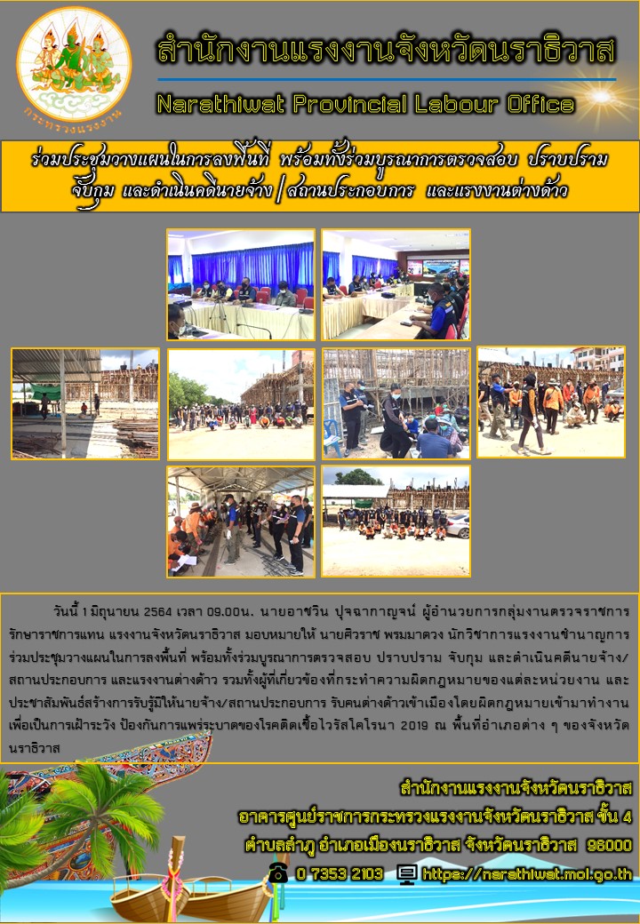 วันนี้ 2 มิถุนายน 2564 เวลา 09.00น. นายอาชวิน ปุจฉากาญจน์ ผู้อำนวยการกลุ่มงานตรวจราชการรักษาราชการแทน แรงงานจังหวัดนราธิวาส มอบหมายให้ นายศิวราช พรมมาดวง นักวิชาการแรงงานชำนาญการ ร่วมประชุมวางแผนในการลงพื้นที่ พร้อมทั้งร่วมบูรณาการตรวจสอบ ปราบปราม จับกุม และดำเนินคดีนายจ้าง/สถานประกอบการ และแรงงานต่างด้าว รวมทั้งผู้ที่เกี่ยวข้องที่กระทำความผิดกฎหมายของแต่ละหน่วยงาน และประชาสัมพันธ์สร้างการรับรู้มิให้นายจ้าง/สถานประกอบการ รับคนต่างด้าวเข้าเมืองโดยผิดกฎหมายเข้ามาทำงานเพื่อเป็นการเฝ้าระวัง ป้องกันการแพร่ระบาดของโรคติดเชื้อไวรัสโคโรนา 2019 ณ พื้นที่อำเภอต่าง ๆ ของจังหวัดนราธิวาส