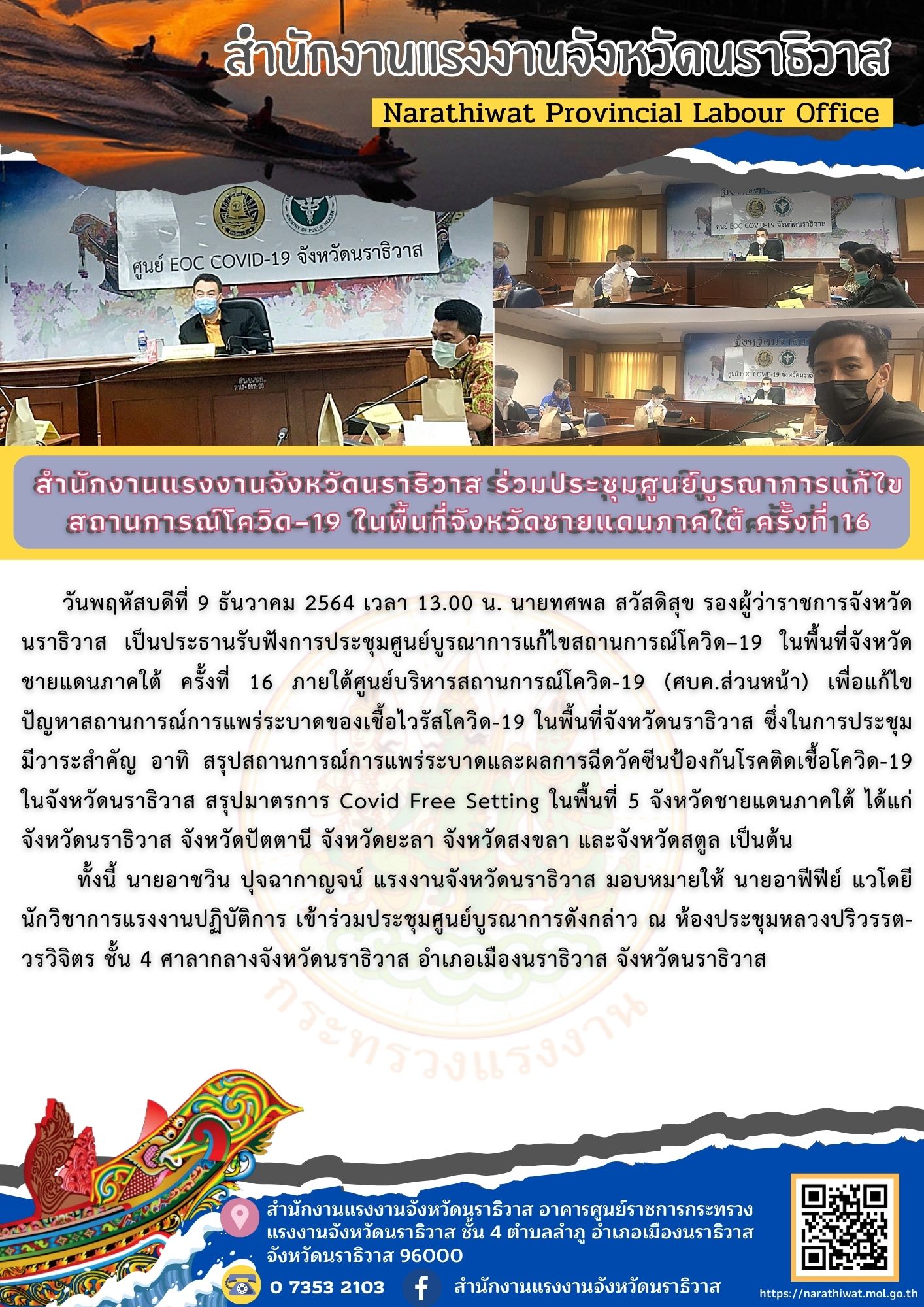 วันพฤหัสบดีที่ 9 ธันวาคม 2564 เวลา 13.00 น. นายทศพล สวัสดิสุข รองผู้ว่าราชการจังหวัดนราธิวาส เป็นประธานรับฟังการประชุมศูนย์บูรณาการแก้ไขสถานการณ์โควิด–19 ในพื้นที่จังหวัดชายแดนภาคใต้ ครั้งที่ 16 ภายใต้ศูนย์บริหารสถานการณ์โควิด-19 (ศบค.ส่วนหน้า) เพื่อแก้ไขปัญหาสถานการณ์การแพร่ระบาดของเชื้อไวรัสโควิด-19 ในพื้นที่จังหวัดนราธิวาส ซึ่งในการประชุมมีวาระสำคัญ อาทิ สรุปสถานการณ์การแพร่ระบาดและผลการฉีดวัคซีนป้องกันโรคติดเชื้อโควิด-19 ในจังหวัดนราธิวาส สรุปมาตรการ Covid Free Setting ในพื้นที่ 5 จังหวัดชายแดนภาคใต้ ได้แก่ จังหวัดนราธิวาส จังหวัดปัตตานี จังหวัดยะลา จังหวัดสงขลา และจังหวัดสตูล เป็นต้น