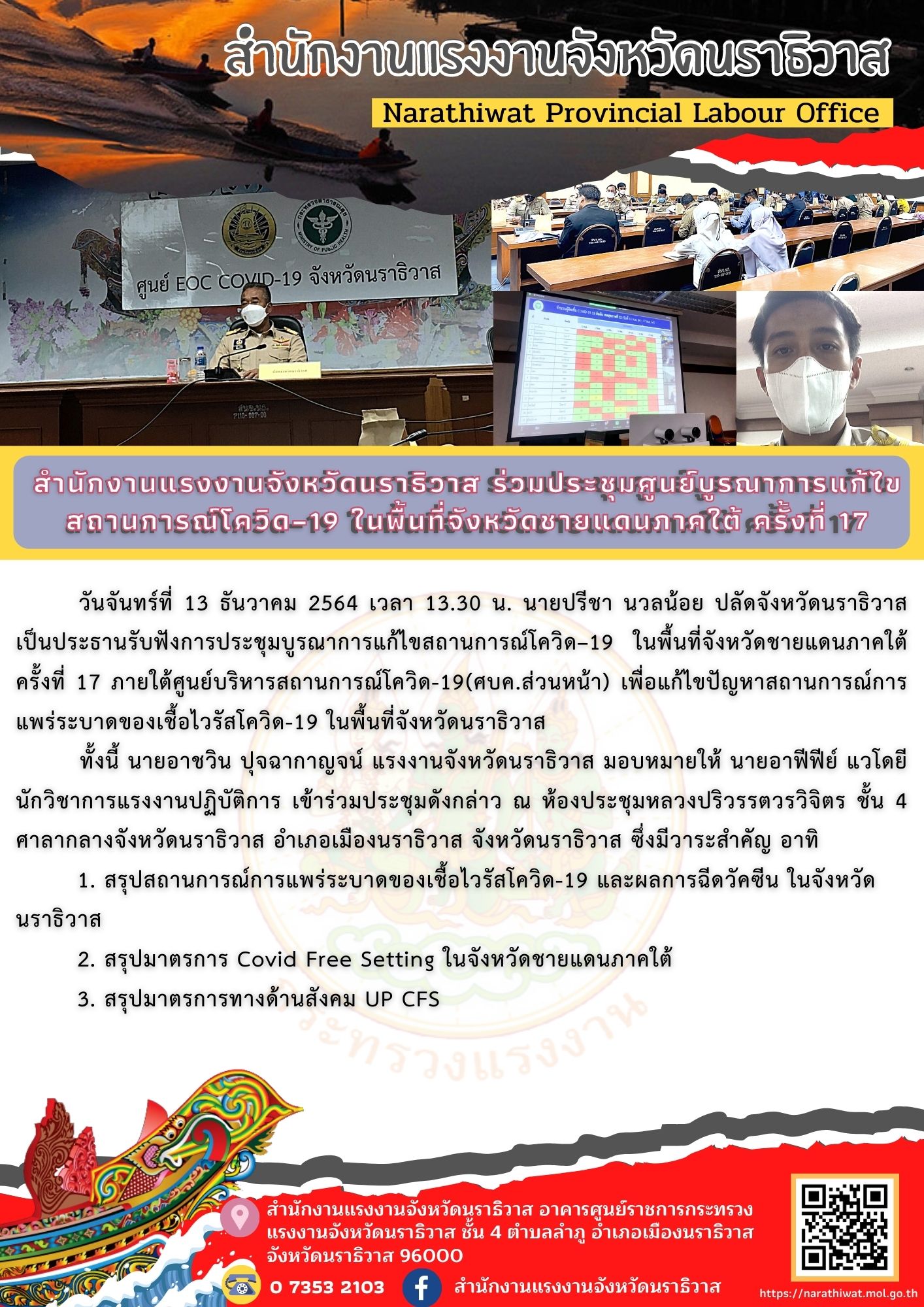 วันจันทร์ที่ 13 ธันวาคม 2564 เวลา 13.30 น. นายปรีชา นวลน้อย ปลัดจังหวัดนราธิวาส เป็นประธานรับฟังการประชุมบูรณาการแก้ไขสถานการณ์โควิด–19 ในพื้นที่จังหวัดชายแดนภาคใต้ ครั้งที่ 17 ภายใต้ศูนย์บริหารสถานการณ์โควิด-19(ศบค.ส่วนหน้า) เพื่อแก้ไขปัญหาสถานการณ์การแพร่ระบาดของเชื้อไวรัสโควิด-19 ในพื้นที่จังหวัดนราธิวาส