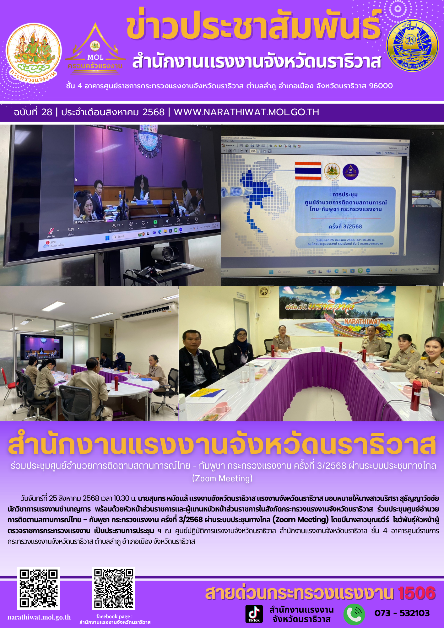 วันจันทร์ที่ 25 สิงหาคม 2568 เวลา 10.30 น. นายสุนทร หมัดแล้ แรงงานจังหวัดนราธิวาส แรงงานจังหวัดนราธิวาส มอบหมายให้นางสาวนริศรา สุธัญญาวัชชัย นักวิชาการแรงงานชำนาญการ พร้อมด้วยหัวหน้าส่วนราชการและผู้แทนหนัวหน้าส่วนราชการในสังกัดกระทรวงแรงงานจังหวัดนราธิวาส ร่วมประชุมศูนย์อำนวยการติดตามสถานการณ์ไทย – กัมพูชา กระทรวงแรงงาน ครั้งที่ 3/2568 ผ่านระบบประชุมทางไกล (Zoom Meeting) โดยมีนางสาวบุณยวีร์ ไขว้พันธุ์หัวหน้าผู้ตรวจราชการกระทรวงแรงงาน เป็นประธานการประชุม ฯ ณ ศูนย์ปฏิบัติการแรงงานจังหวัดนราธิวาส สำนักงานแรงงานจังหวัดนราธิวาส ชั้น 4 อาคารศูนย์ราชการกระทรวงแรงงานจังหวัดนราธิวาส ตำบลลำภู อำเภอเมือง จังหวัดนราธิวาส
