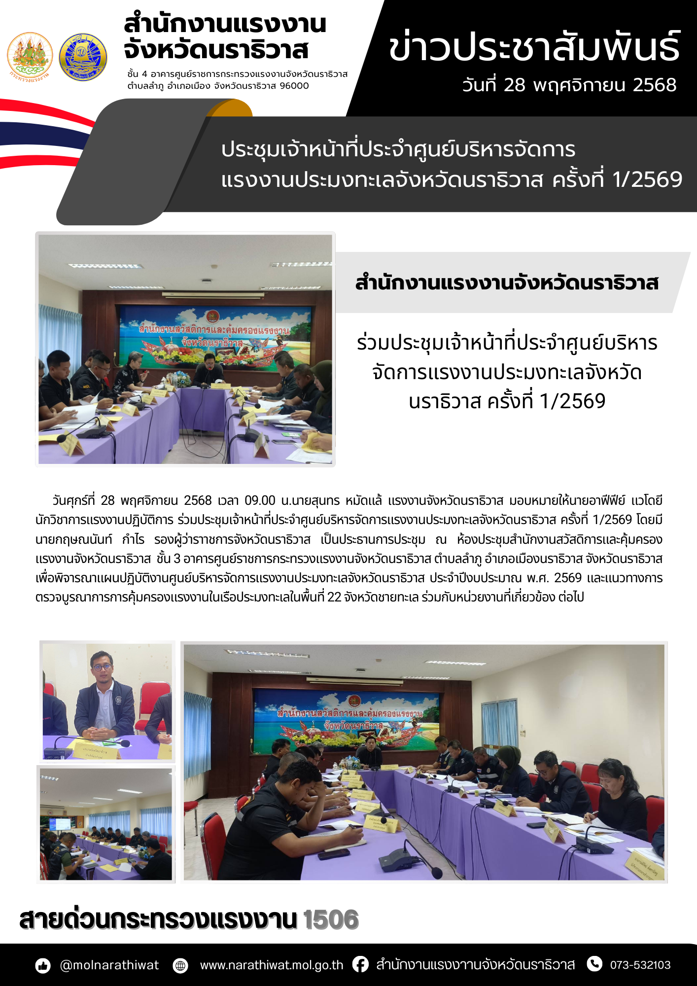 วันศุกร์ที่ 28 พฤศจิกายน 2568 เวลา 09.00 น.นายสุนทร หมัดแล้ แรงงานจังหวัดนราธิวาส มอบหมายให้นายอาฟีฟีย์ แวโดยี นักวิชาการแรงงานปฏิบัติการ ร่วมประชุมเจ้าหน้าที่ประจำศูนย์บริหารจัดการแรงงานประมงทะเลจังหวัดนราธิวาส ครั้งที่ 1/2569 โดยมีนายกฤษณนันท์ กำไร รองผู้ว่าราาชการจังหวัดนราธิวาส เป็นประธานการประชุม ณ ห้องประชุมสำนักงานสวัสดิการและคุ้มครองแรงงานจังหวัดนราธิวาส ชั้น 3 อาคารศูนย์ราชการกระทรวงแรงงานจังหวัดนราธิวาส ตำบลลำภู อำเภอเมืองนราธิวาส จังหวัดนราธิวาส เพื่อพิจารณาแผนปฏิบัติงานศูนย์บริหารจัดการแรงงานประมงทะเลจังหวัดนราธิวาส ประจำปีงบประมาณ พ.ศ. 2569 และแนวทางการตรวจบูรณาการการคุ้มครองแรงงานในเรือประมงทะเลในพื้นที่ 22 จังหวัดชายทะเล ร่วมกับหน่วยงานที่เกี่ยวข้อง ต่อไป