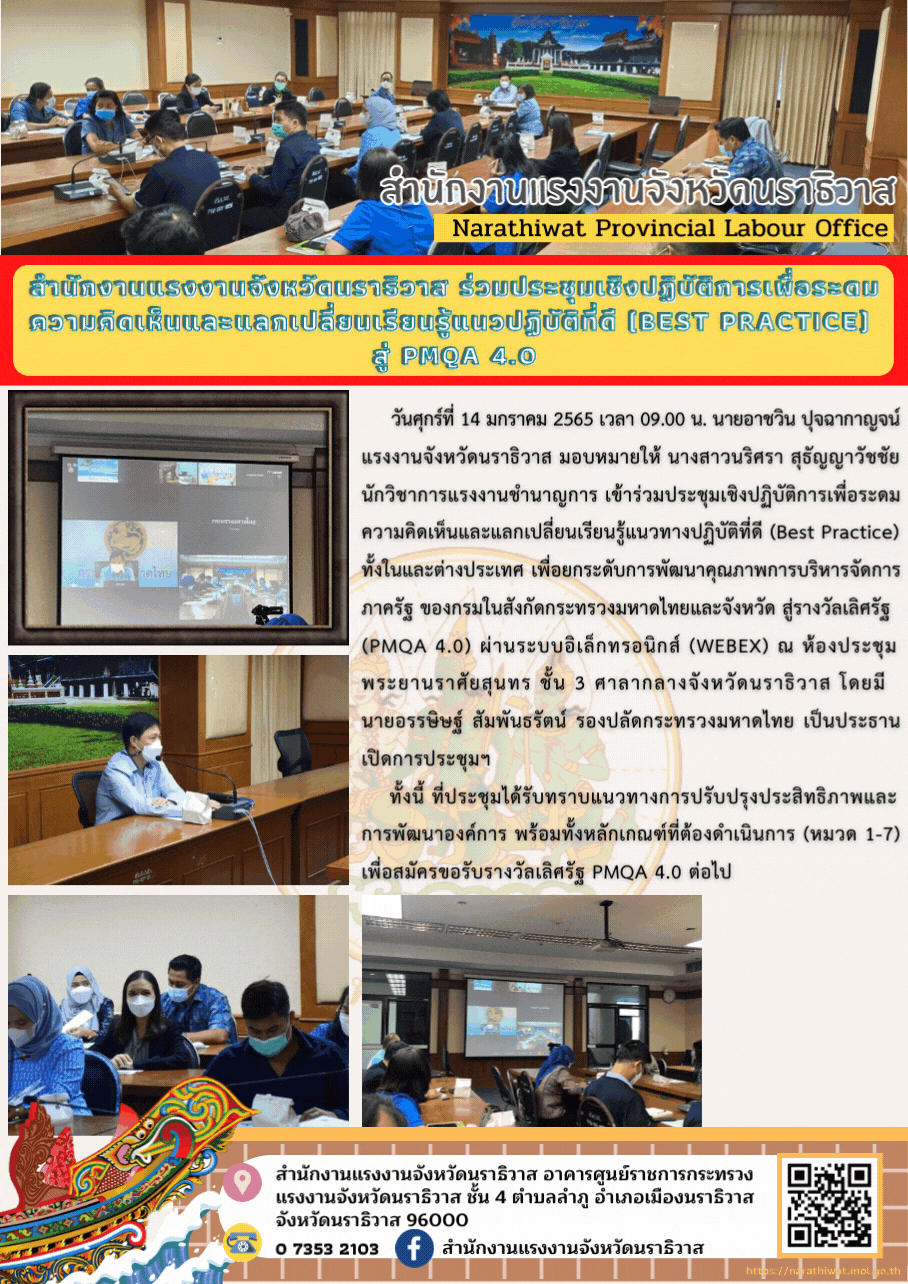 วันศุกร์ที่ 14 มกราคม 2565 เวลา 09.00 น. นายอาชวิน ปุจฉากาญจน์ แรงงานจังหวัดนราธิวาส มอบหมายให้ นางสาวนริศรา สุธัญญาวัชชัย นักวิชาการแรงงานชำนาญการ เข้าร่วมประชุมเชิงปฏิบัติการเพื่อระดมความคิดเห็นและแลกเปลี่ยนเรียนรู้แนวทางปฏิบัติที่ดี (Best Practice) ทั้งในและต่างประเทศ เพื่อยกระดับการพัฒนาคุณภาพการบริหารจัดการภาครัฐ ของกรมในสังกัดกระทรวงมหาดไทยและจังหวัดสู่รางวัลเลิศรัฐ (PMQA 4.0) ผ่านระบบอิเล็กทรอนิกส์ (WEBEX) ณ ห้องประชุมพระยานราศัยสุนทร ชั้น 3 ศาลากลางจังหวัดนราธิวาส โดยมี นายอรรษิษฐ์ สัมพันธรัตน์ รองปลัดกระทรวงมหาดไทย เป็นประธานเปิดการประชุมฯ