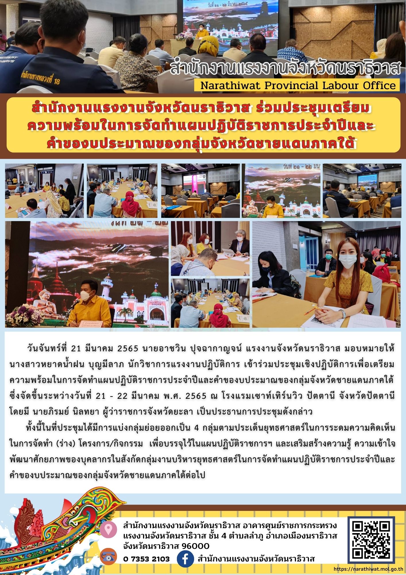 วันจันทร์ที่ 21 มีนาคม 2565 นายอาชวิน ปุจฉากาญจน์ แรงงานจังหวัดนราธิวาส มอบหมายให้ นางสาวหยาดน้ำฝน บุญมีลาภ นักวิชาการแรงงานปฏิบัติการ เข้าร่วมประชุมเชิงปฏิบัติการเพื่อเตรียมความพร้อมในการจัดทำแผนปฏิบัติราชการประจำปีและคำของบประมาณของกลุ่มจังหวัดชายแดนภาคใต้ ซึ่งจัดขึ้นระหว่างวันที่ 21 – 22 มีนาคม พ.ศ. 2565 ณ โรงแรมเซาท์เทิร์นวิว ปัตตานี จังหวัดปัตตานี โดยมี นายภิรมย์ นิลทยา ผู้ว่าราชการจังหวัดยะลา เป็นประธานการประชุมดังกล่าว