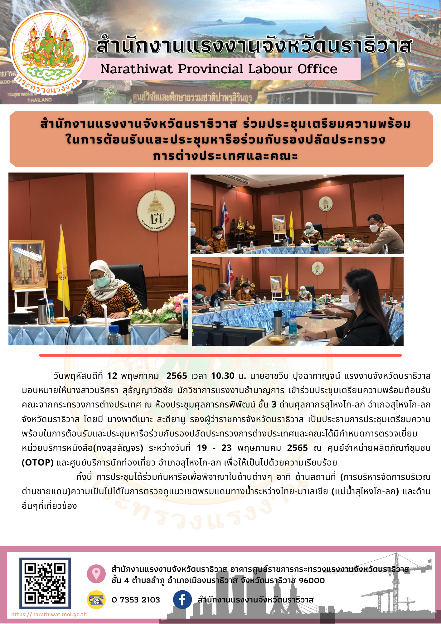 วันพฤหัสบดีที่ 12 พฤษภาคม 2565 เวลา 10.30 น. นายอาชวิน ปุจฉากาญจน์ แรงงานจังหวัดนราธิวาส มอบหมายให้นางสาวนริศรา สุธัญญาวัชชัย นักวิชาการแรงงานชำนาญการ เข้าร่วมประชุมเตรียมความพร้อมต้อนรับคณะจากกระทรวงการต่างประเทศ ณ ห้องประชุมศุลการกรพิพัฒน์ ชั้น 3 ด่านศุลกากรสุไหงโก-ลก อำเภอสุไหงโก-ลก จังหวัดนราธิวาส โดยมี นางพาตีเมาะ สะดียามู รองผู้ว่าราชการจังหวัดนราธิวาส เป็นประธานการประชุมเตรียมความพร้อมในการต้อนรับและประชุมหารือร่วมกับรองปลัดประทรวงการต่างประเทศและคณะได้มีกำหนดการตรวจเยี่ยมหน่วยบริการหนังสือ(กงสุลสัญจร) ระหว่างวันที่ 19 – 23 พฤษภามคม 2565 ณ ศุนย์จำหน่ายผลิตภัณฑ์ชุมชน (OTOP) และศูนย์บริการนักท่องเที่ยว อำเภอสุไหงโก-ลก เพื่อให้เป็นไปด้วยความเรียบร้อย