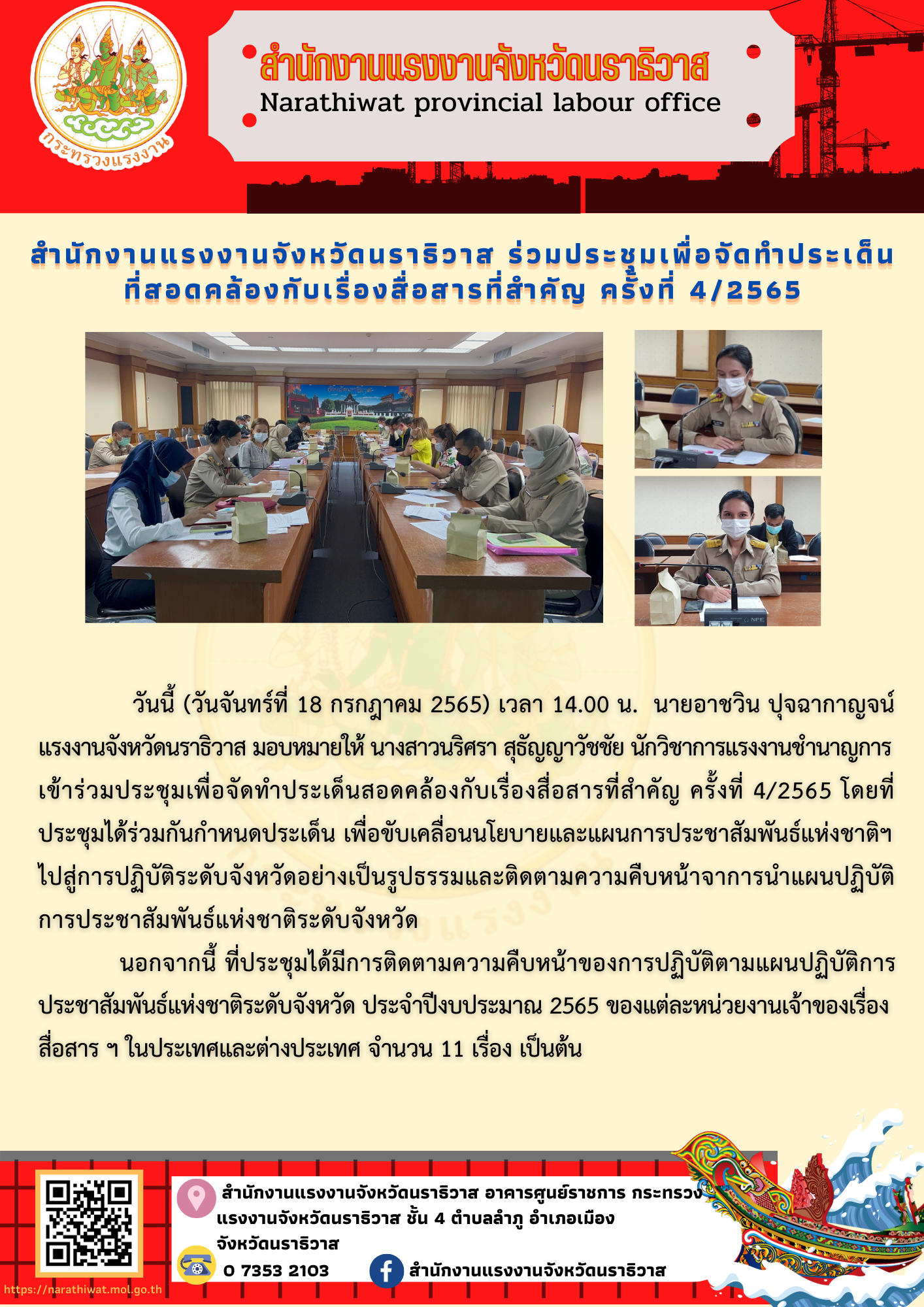 วันนี้ (วันจันทร์ที่ 18 กรกฎาคม 2565) เวลา 14.00 น. นายอาชวิน ปุจฉากาญจน์แรงงานจังหวัดนราธิวาส มอบหมายให้ นางสาวนริศรา สุธัญญาวัชชัย นักวิชาการแรงงานชำนาญการ เข้าร่วมประชุมเพื่อจัดทำประเด็นสอดคล้องกับเรื่องสื่อสารที่สำคัญ ครั้งที่ 4/2565 โดยที่ประชุมได้ร่วมกันกำหนดประเด็น เพื่อขับเคลื่อนนโยบายและแผนการประชาสัมพันธ์แห่งชาติฯ ไปสู่การปฏิบัติระดับจังหวัดอย่างเป็นรูปธรรมและติดตามความคืบหน้าจาการนำแผนปฏิบัติการประชาสัมพันธ์แห่งชาติระดับจังหวัด
