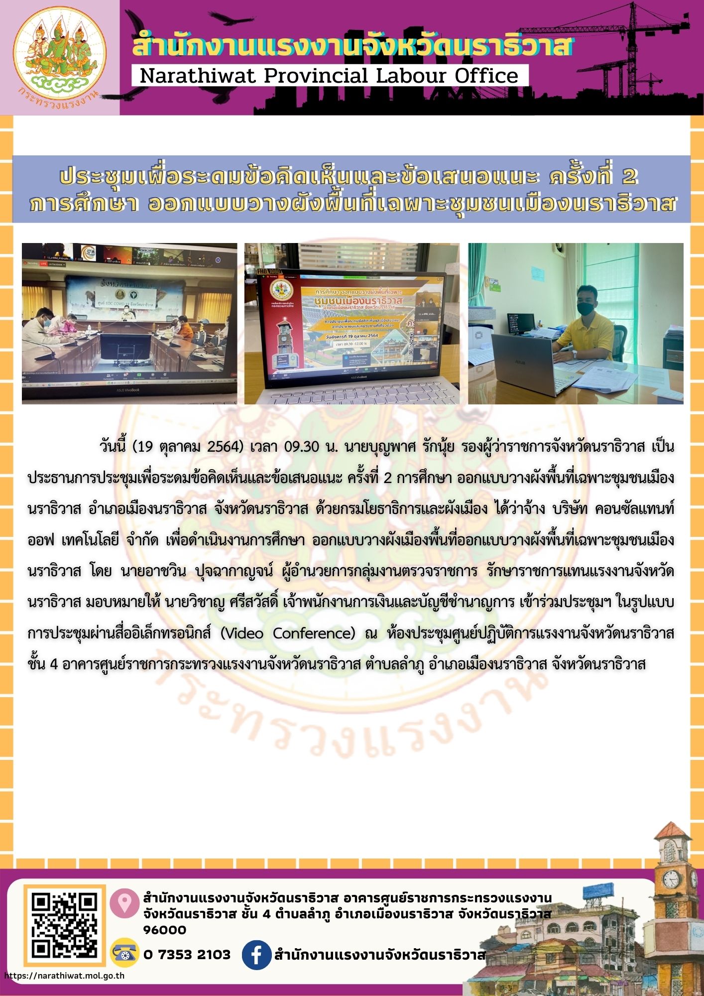 วันนี้ (19 ตุลาคม 2564) เวลา 09.30 น. นายบุญพาศ รักนุ้ย รองผู้ว่าราชการจังหวัดนราธิวาส เป็นประธานการประชุมเพื่อระดมข้อคิดเห็นและข้อเสนอแนะ ครั้งที่ 2 การศึกษา ออกแบบวางผังพื้นที่เฉพาะชุมชนเมืองนราธิวาส อำเภอเมืองนราธิวาส จังหวัดนราธิวาส ด้วยกรมโยธาธิการและผังเมือง ได้ว่าจ้าง บริษัท คอนซัลเเทนท์ ออฟ เทคโนโลยี จำกัด เพื่อดำเนินงานการศึกษา ออกแบบวางผังเมืองพื้นที่ออกแบบวางผังพื้นที่เฉพาะชุมชนเมืองนราธิวาส โดย นายอาชวิน ปุจฉากาญจน์ ผู้อำนวยการกลุ่มงานตรวจราชการ รักษาราชการแทนแรงงานจังหวัดนราธิวาส มอบหมายให้ นายวิชาญ ศรีสวัสดิ์ เจ้าพนักงานการเงินและบัญชีชำนาญการ เข้าร่วมประชุมฯ ในรูปแบบการประชุมผ่านสื่ออิเล็กทรอนิกส์ (Video Conference) ณ ห้องประชุมศูนย์ปฏิบัติการแรงงานจังหวัดนราธิวาส ชั้น 4 อาคารศูนย์ราชการกระทรวงแรงงานจังหวัดนราธิวาส ตำบลลำภู อำเภอเมืองนราธิวาส จังหวัดนราธิวาส