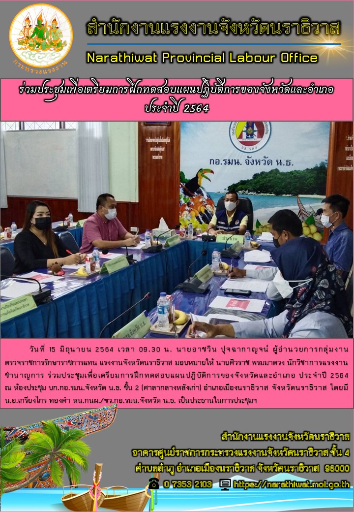 วันที่ 15 มิถุนายน 2564 เวลา 09.30 น. นายอาชวิน ปุจฉากาญจน์ ผู้อำนวยการกลุ่มงานตรวจราชการรักษาราชการแทน แรงงานจังหวัดนราธิวาส มอบหมายให้ นายศิวราช พรมมาดวง นักวิชาการแรงงานชำนาญการ ร่วมประชุมเพื่อเตรียมการฝึกทดสอบแผนปฏิบัติการของจังหวัดและอำเภอ ประจำปี 2564ณ ห้องประชุม บก.กอ.รมน.จังหวัด น.ธ. ชั้น 2 (ศาลากลางหลังเก่า) อำเภอเมืองนราธิวาส จังหวัดนราธิวาส โดยมี น.อ.เกรียงไกร ทองคำ หน.กนผ./ขว.กอ.รมน.จังหวัด น.ธ. เป็นประธานในการประชุมฯ