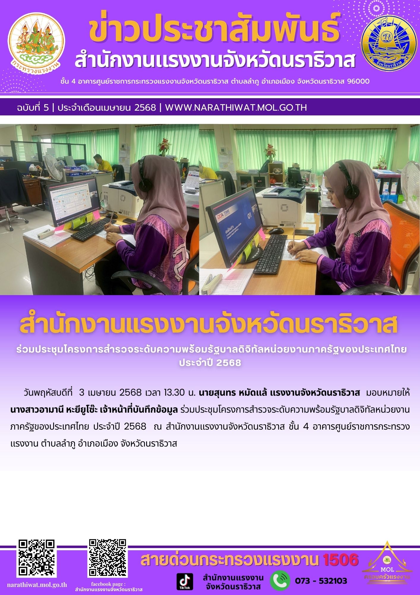 วันพฤหัสบดีที่ 3 เมษายน 2568 เวลา 13.30 น. นายสุนทร หมัดแล้ แรงงานจังหวัดนราธิวาส มอบหมายให้นางสาวอามานี หะยียูโซ๊ะ เจ้าหน้าที่บันทึกข้อมูล ร่วมประชุมโครงการสำรวจระดับความพร้อมรัฐบาลดิจิทัลหน่วยงานภาครัฐของประเทศไทย ประจำปี 2568 ณ สำนักงานแรงงานจังหวัดนราธิวาส ชั้น 4 อาคารศูนย์ราชการกระทรวงแรงงาน ตำบลลำภู อำเภอเมือง จังหวัดนราธิวาส