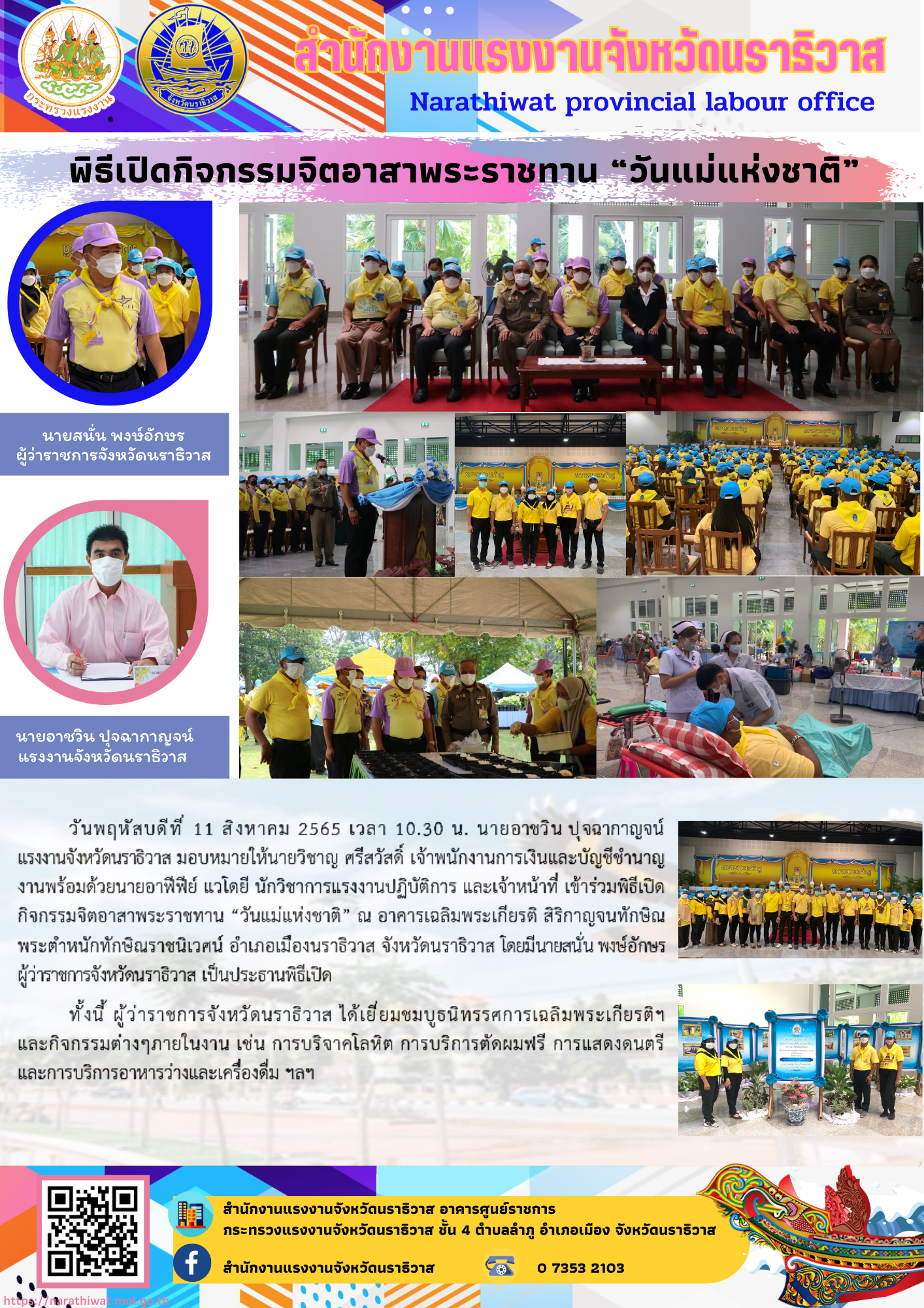 วันพฤหัสบดีที่ 11 สิงหาคม 2565 เวลา 10.30 นายอาชวิน ปุจฉากาญจน์ แรงงานจังหวัดนราธิวาส มอบหมายให้นายวิชาญ ศรีสวัสดิ์ เจ้าพนักงานการเงินและบัญชีชำนาญงานพร้อมด้วยนาฮาฟีฟีย์ แวโดยี นักวิชาการแรงงานปฎิบัติการ และเจ้าหน้าที่ เข้าร่วมพิธีเปิดกิจกรรมจิตอาสาพระราชทาน”วันแม่เเห่งชาติ” ณ อาคารเฉลิมพระเกียรติ สิริกาญจนทักษิณ พระตำหนักทักษิณราชนิเวศน์ อำเภอเมืองนราธิวาส จังหวัดนราธิวาส โดยมีนายสนั่น พงษ์อักษร ผู้ว่าราชการจังหวัดนราธิวาส เป็นประธานพิธีเปิด