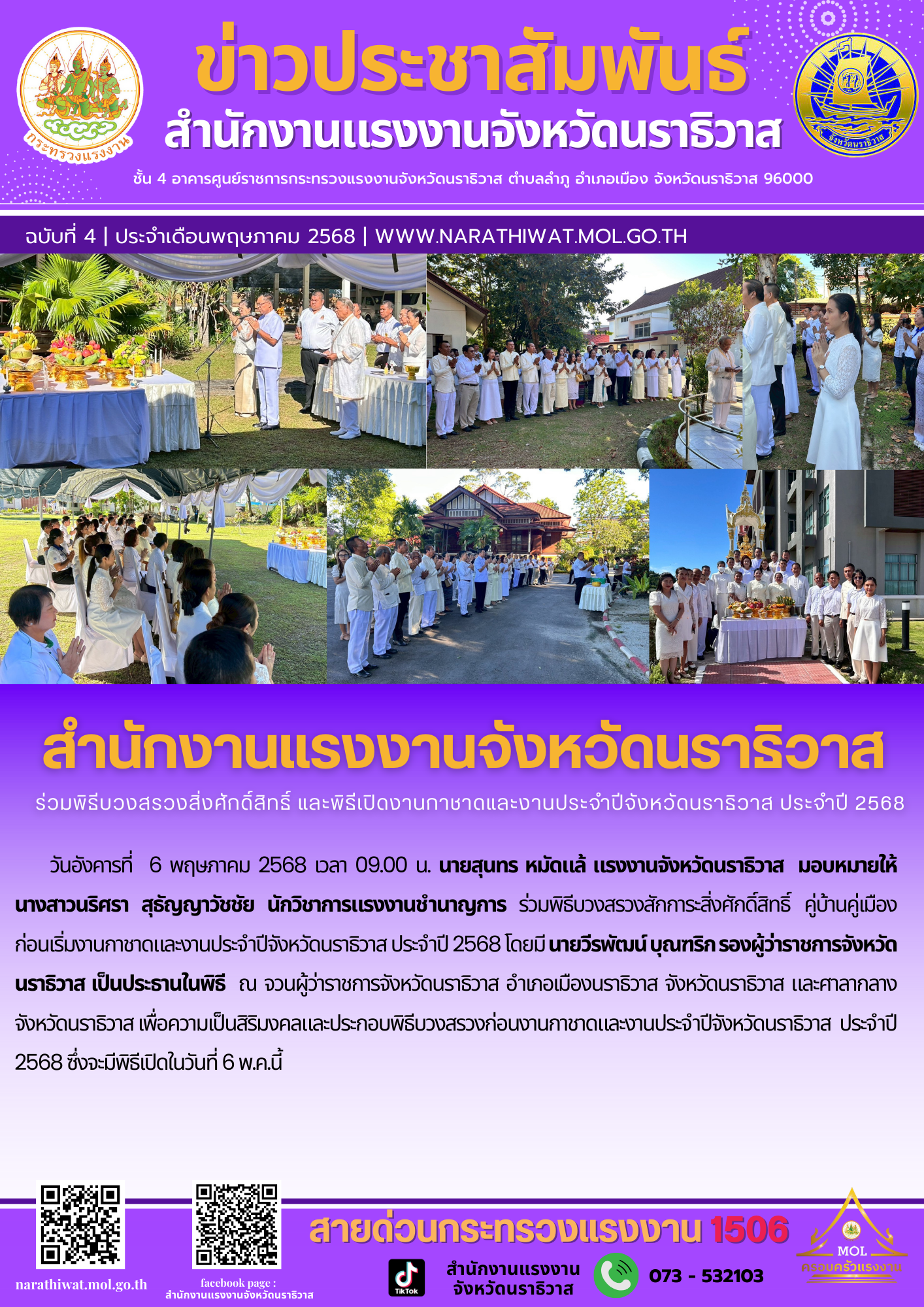 วันอังคารที่ 6 พฤษภาคม 2568 เวลา 09.00 น. นายสุนทร หมัดแล้ แรงงานจังหวัดนราธิวาส มอบหมายให้ นางสาวนริศรา สุธัญญาวัชชัย นักวิชาการแรงงานชำนาญการ ร่วมพิธีบวงสรวงสักการะสิ่งศักดิ์สิทธิ์ คู่บ้านคู่เมือง ก่อนเริ่มงานกาชาดและงานประจำปีจังหวัดนราธิวาส ประจำปี 2568 โดยมี นายวีรพัฒน์ บุณฑริก รองผู้ว่าราชการจังหวัดนราธิวาส เป็นประธานในพิธี ณ จวนผู้ว่าราชการจังหวัดนราธิวาส อำเภอเมืองนราธิวาส จังหวัดนราธิวาส และศาลากลางจังหวัดนราธิวาส เพื่อความเป็นสิริมงคลและประกอบพิธีบวงสรวงก่อนงานกาชาดและงานประจำปีจังหวัดนราธิวาส ประจำปี 2568 ซึ่งจะมีพิธีเปิดในวันที่ 6 พ.ค.นี้