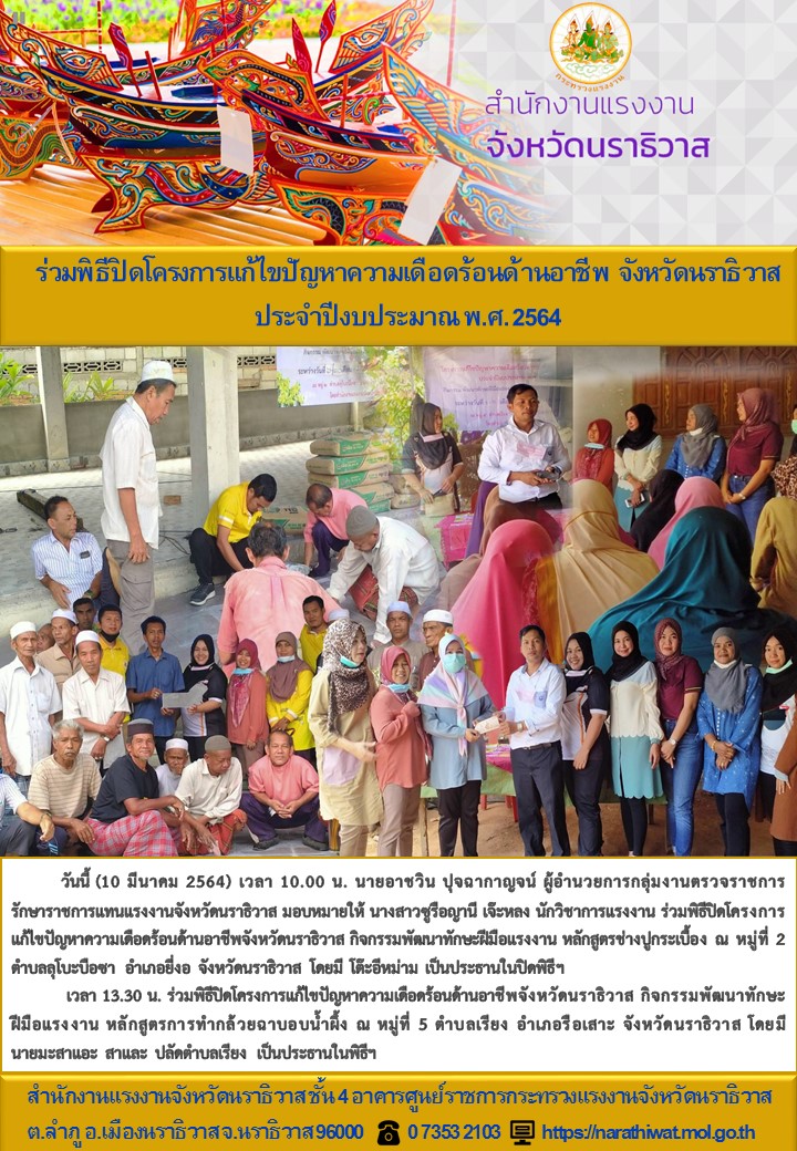 สำนักงานแรงงานจังหวัดนราธิวาส ร่วมพิธีปิดโครงการแก้ไขปัญหาความเดือดร้อนด้านอาชีพจังหวัดนราธิวาส กิจกรรมพัฒนาทักษะฝีมือแรงงาน หลักสูตรช่างปูกระเบื้อง ณ หมู่ที่ 2 ตำบลลุโบะบือซา อำเภอยี่งอ จังหวัดนราธิวาส โดยมี โต๊ะอีหม่าม เป็นประธานในปิดพิธีฯ