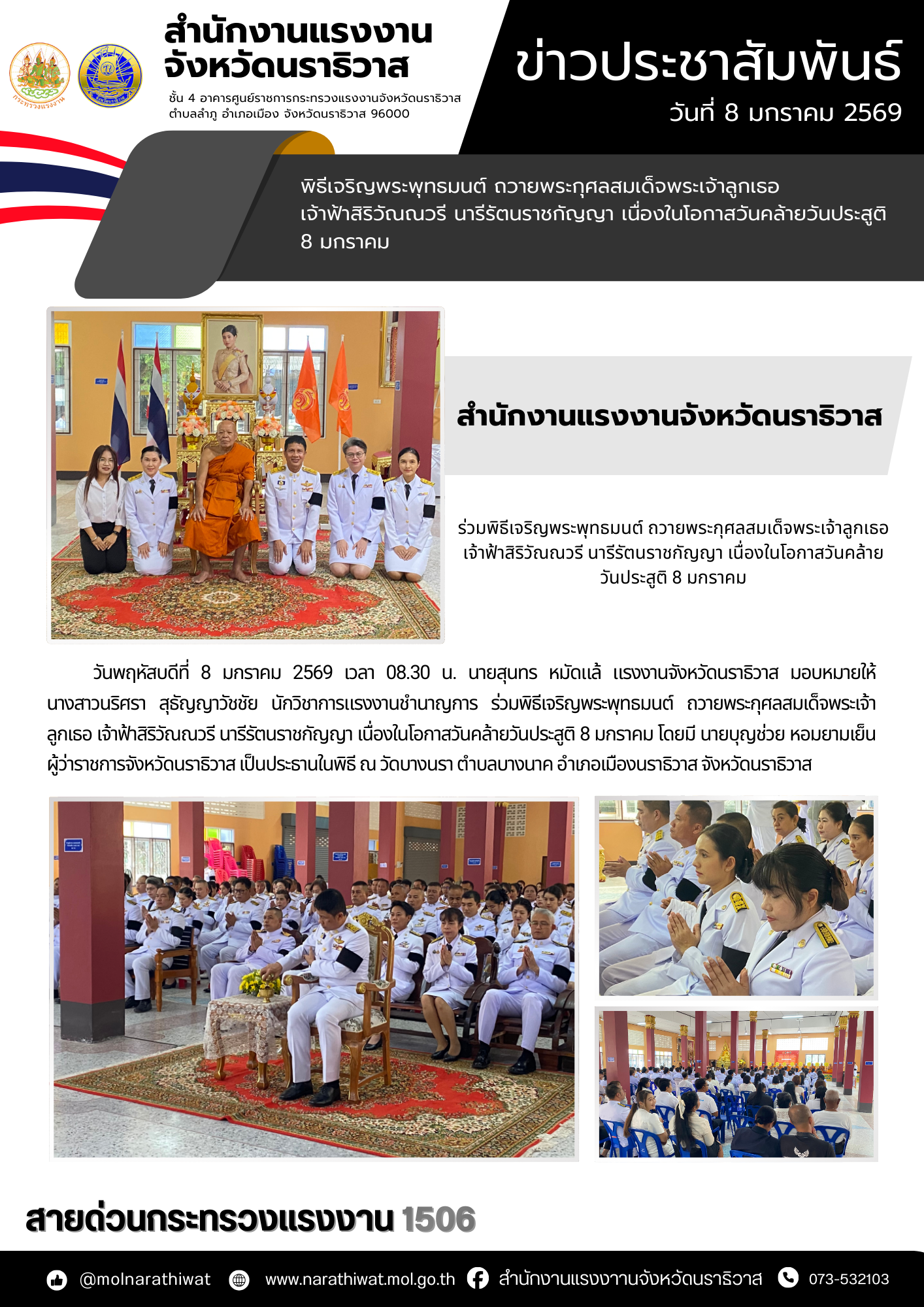 วันพฤหัสบดีที่ 8 มกราคม 2569 เวลา 08.30 น. นายสุนทร หมัดแล้ แรงงานจังหวัดนราธิวาส มอบหมายให้ นางสาวนริศรา สุธัญญาวัชชัย นักวิชาการแรงงานชำนาญการ ร่วมพิธีเจริญพระพุทธมนต์ ถวายพระกุศลสมเด็จพระเจ้าลูกเธอ เจ้าฟ้าสิริวัณณวรี นารีรัตนราชกัญญา เนื่องในโอกาสวันคล้ายวันประสูติ 8 มกราคม โดยมี นายบุญช่วย หอมยามเย็น ผู้ว่าราชการจังหวัดนราธิวาส เป็นประธานในพิธี ณ วัดบางนรา ตำบลบางนาค อำเภอเมืองนราธิวาส จังหวัดนราธิวาส