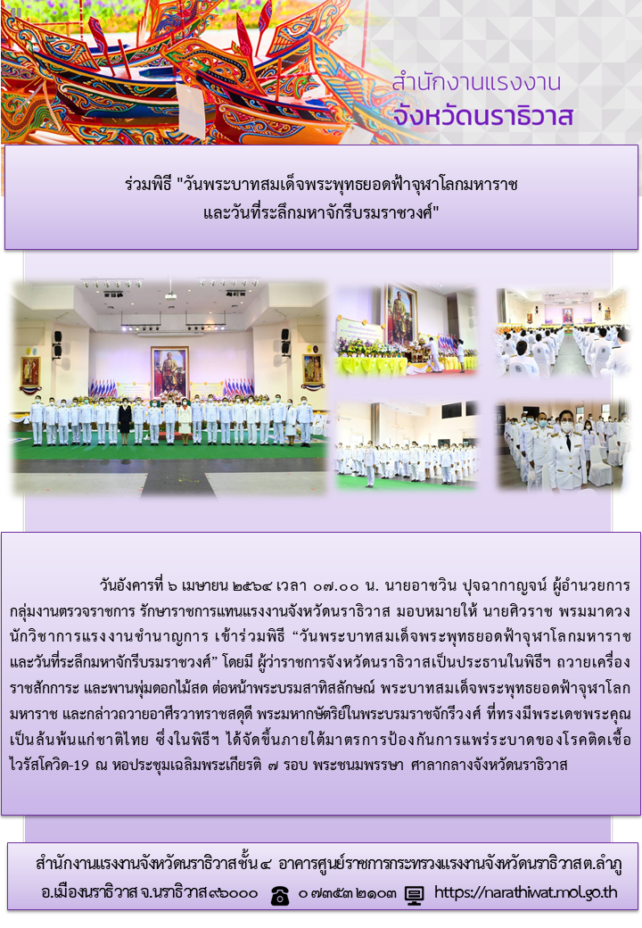 วันอังคารที่ 6 เมษายน 2564 เวลา 07.00 น. นายอาชวิน ปุจฉากาญจน์ ผู้อำนวยการกลุ่มงานตรวจราชการ รักษาราชการแทนแรงงานจังหวัดนราธิวาส มอบหมายให้ นายศิวราช พรมมาดวง นักวิชาการแรงงานชำนาญการ เข้าร่วมพิธี “วันพระบาทสมเด็จพระพุทธยอดฟ้าจุฬาโลกมหาราชและวันที่ระลึกมหาจักรีบรมราชวงศ์” โดยมี ผู้ว่าราชการจังหวัดนราธิวาสเป็นประธานในพิธีฯ ถวายเครื่องราชสักการะ และพานพุ่มดอกไม้สด ต่อหน้าพระบรมสาทิสลักษณ์ พระบาทสมเด็จพระพุทธยอดฟ้าจุฬาโลกมหาราช และกล่าวถวายอาศีรวาทราชสดุดี พระมหากษัตริย์ในพระบรมราชจักรีวงศ์ ที่ทรงมีพระเดชพระคุณเป็นล้นพ้นแก่ชาติไทย ซึ่งในพิธีฯ ได้จัดขึ้นภายใต้มาตรการป้องกันการแพร่ระบาดของโรคติดเชื้อไวรัสโควิด–19 ณ หอประชุมเฉลิมพระเกียรติ 7 รอบ พระชนมพรรษา ศาลากลางจังหวัดนราธิวาส