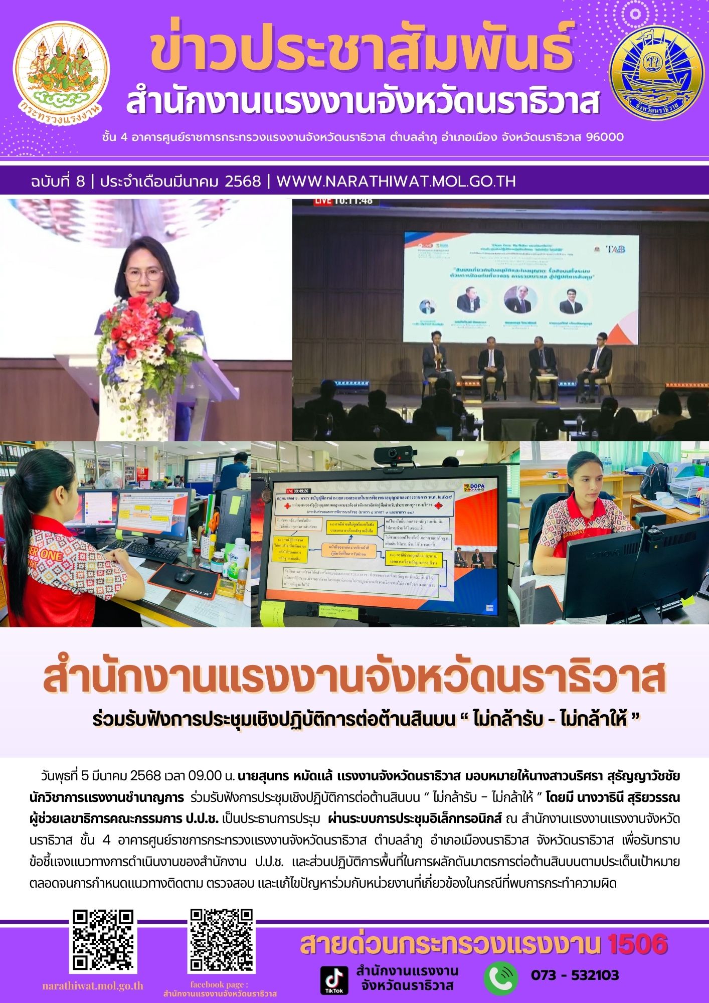 วันพุธที่ 5 มีนาคม 2568 เวลา 09.00 น. นายสุนทร หมัดแล้ แรงงานจังหวัดนราธิวาส มอบหมายให้นางสาวนริศรา สุธัญญาวัชชัย นักวิชาการแรงงานชำนาญการ ร่วมรับฟังการประชุมเชิงปฏิบัติการต่อต้านสินบน “ ไม่กล้ารับ – ไม่กล้าให้ ” โดยมี นางวาธินี สุริยวรรณ ผู้ช่วยเลขาธิการคณะกรรมการ ป.ป.ช. เป็นประธานการประุม ผ่านระบบการประชุมอิเล็กทรอนิกส์ ณ สำนักงานแรงงานแรงงานจังหวัดนราธิวาส ชั้น 4 อาคารศูนย์ราชการกระทรวงแรงงานจังหวัดนราธิวาส ตำบลลำภู อำเภอเมืองนราธิวาส จังหวัดนราธิวาส เพื่อรับทราบ ข้อชี้แจงแนวทางการดำเนินงานของสำนักงาน ป.ป.ช. และส่วนปฏิบัติการพื้นที่ในการผลักดันมาตรการต่อต้านสินบนตามประเด็นเป้าหมาย ตลอดจนการกำหนดแนวทางติดตาม ตรวจสอบ และแก้ไขปัญหาร่วมกับหน่วยงานที่เกี่ยวข้องในกรณีที่พบการกระทำความผิด